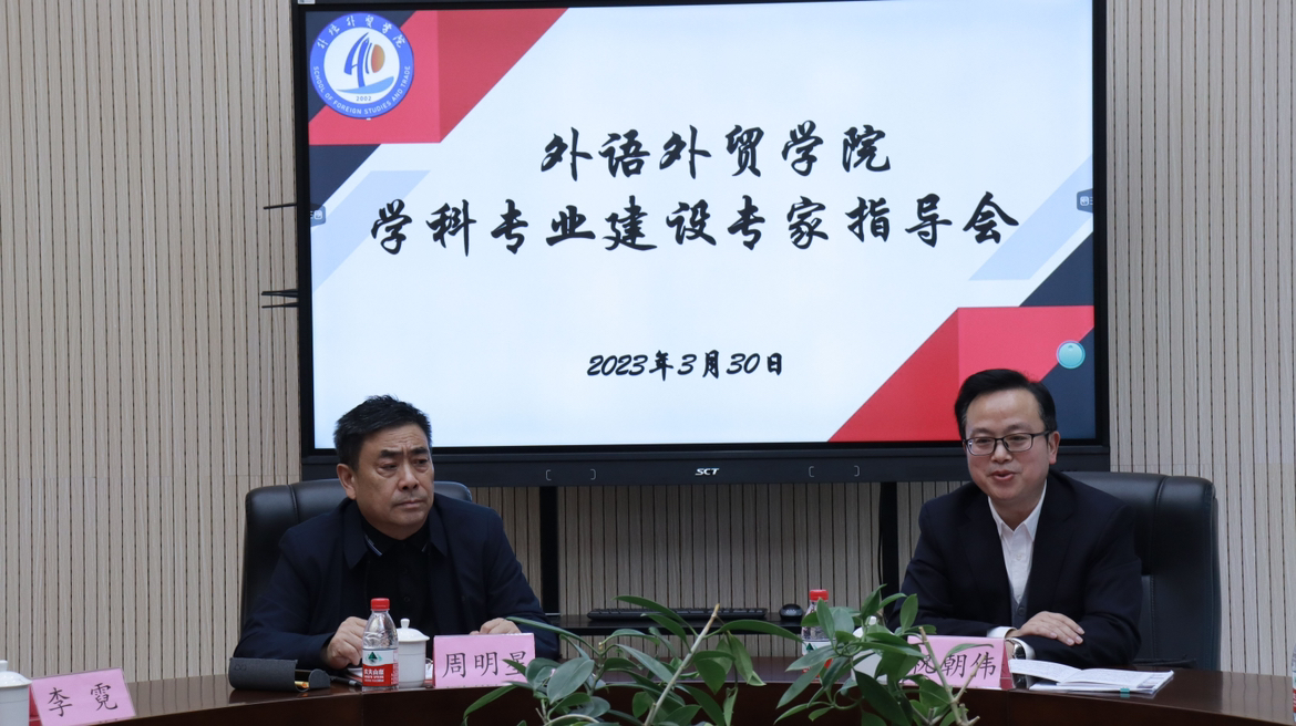 为进一步探索外语类专业学科专业建设路径,提升学院办学水平,提高学院人才培养质量,外语外贸学院于2023年3月30日14:30在9104会议室举办“学科专业建设专家指导会”。本次指导会邀请了四川外国语大学副校长祝朝伟、重庆对外经贸学院副校长周明星、教务处处长曾雪梅、外语外贸学院院长李霓、外语外贸学院副院长吴耀熙、学科方向带头人张荣建、李龙泉以及各专业系部主任参加会议。会议由外语外贸学院副院长吴耀熙主持。