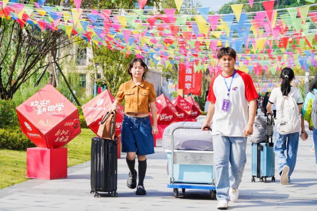 报到日当天,校门口的热闹场景格外引人注目。早上八点,新生们陆续到达校园,伴随着亲友的祝福与期盼。踏入了他们未来四年的求学之旅,各学院领导、老师、志愿者以热情、周到、负责的态度指引各学院新生进行报名、缴费、领取物资、寝室入住等报到流程,努力为新生营造良好的报到环境。同时,校内安排了休息区、免费领水区、行李寄存区,处处都能看见作为学长学姐的志愿者帮忙与解答的身影。新同学们体会到了学校的关怀之情。