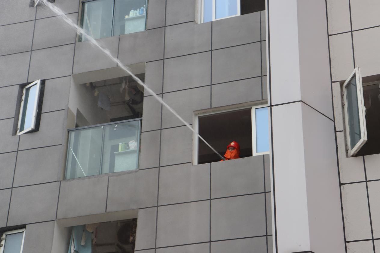 指令下达后,模拟烟雾弥漫,警铃响起。公寓值班人员迅速响应并上报火情。与A校区不同的是,B校区特邀合川区消防救援支队的消防员参与,增强了演练的真实性和专业性。