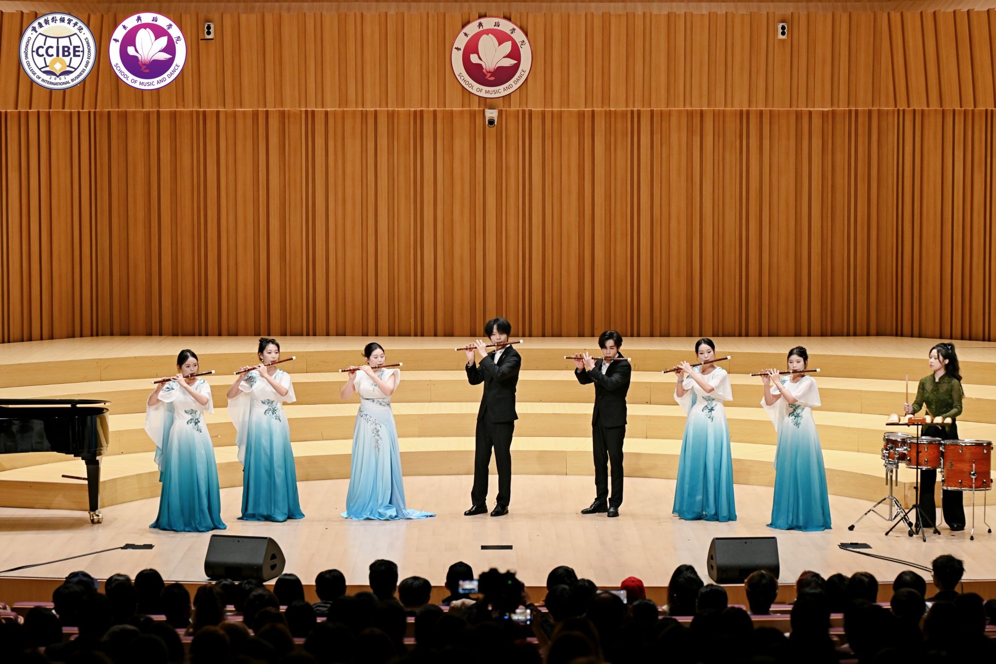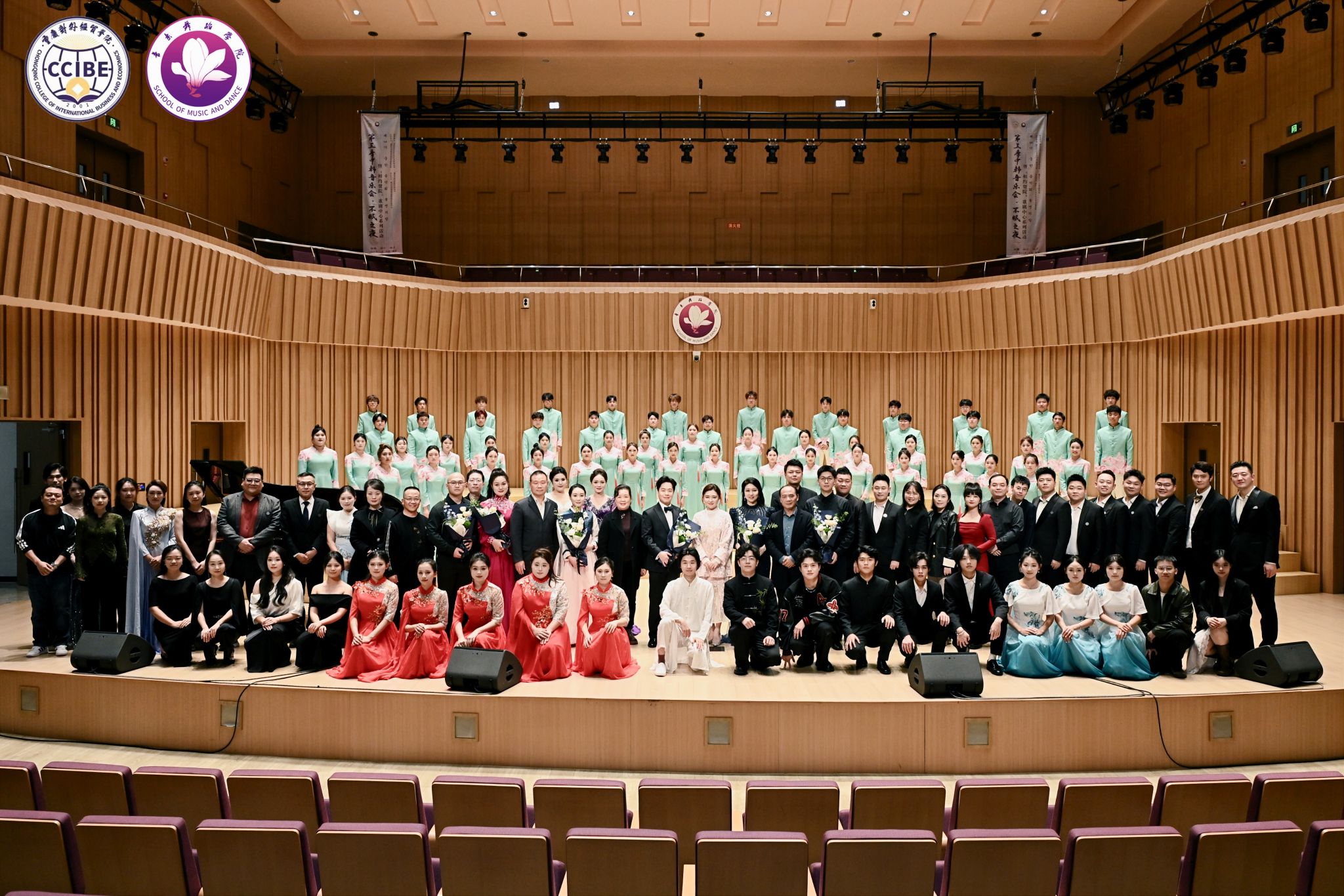 中外艺术融合环节中,韩国歌手李明铉、朴秀珍合作的普契尼歌剧《波西米亚人》选段《冰凉的小手》《人们叫我咪咪》以及浪漫二重唱《多么美丽的姑娘》实现了文化共鸣;尾声的合唱《细雨飘》(重庆酉阳民歌改编)与校歌《经世经贸》,将地方文化与校园精神相融,引发全场情感共鸣。