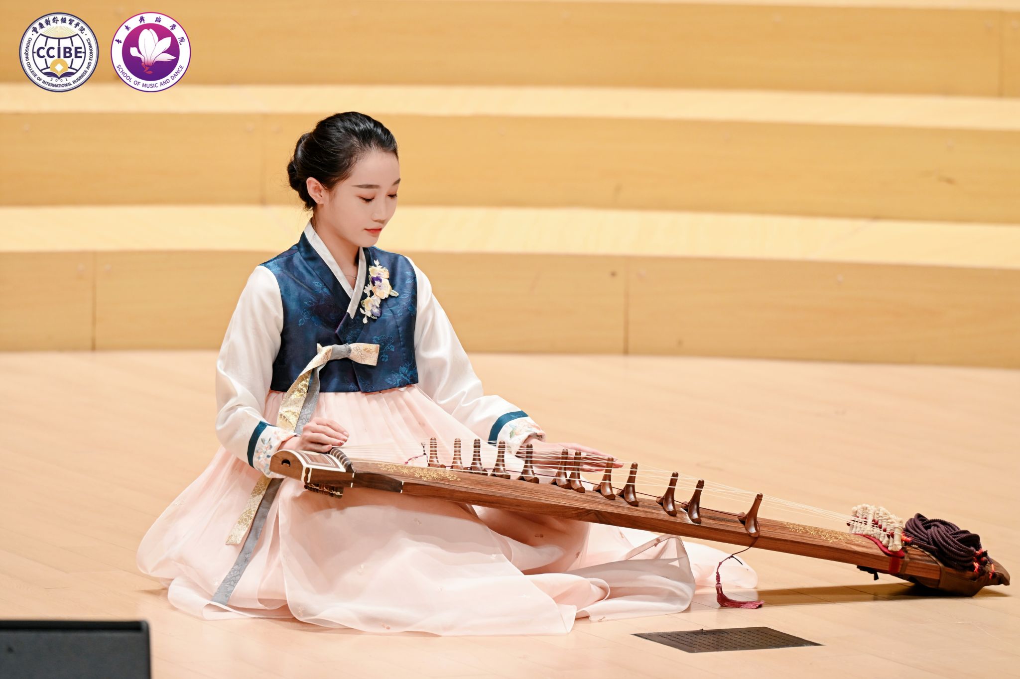 音乐会紧扣“中韩文化艺术交融”主题,由中韩艺术家与校内师生联袂呈现16个精彩节目,在传统与现代的碰撞中,尽显两国艺术的独特魅力与蓬勃活力。中国传统艺术篇章里,学院阿卡贝拉人声乐团演绎的《不要怕》,以纯净人声勾勒青春韵律;古筝重奏《唱支山歌给党听》婉转磅礴,彰显传统器乐神韵;钢琴协奏曲《黄河》第一乐章激昂澎湃,传递中华民族精神气魄;多民族民歌联唱《凤阳花鼓》等作品展现中国艺术的多元厚重;唢呐独奏《欢腾》则以欢快旋律点燃全场热情。