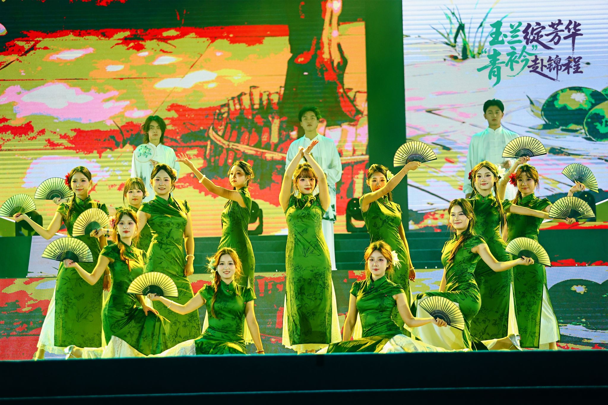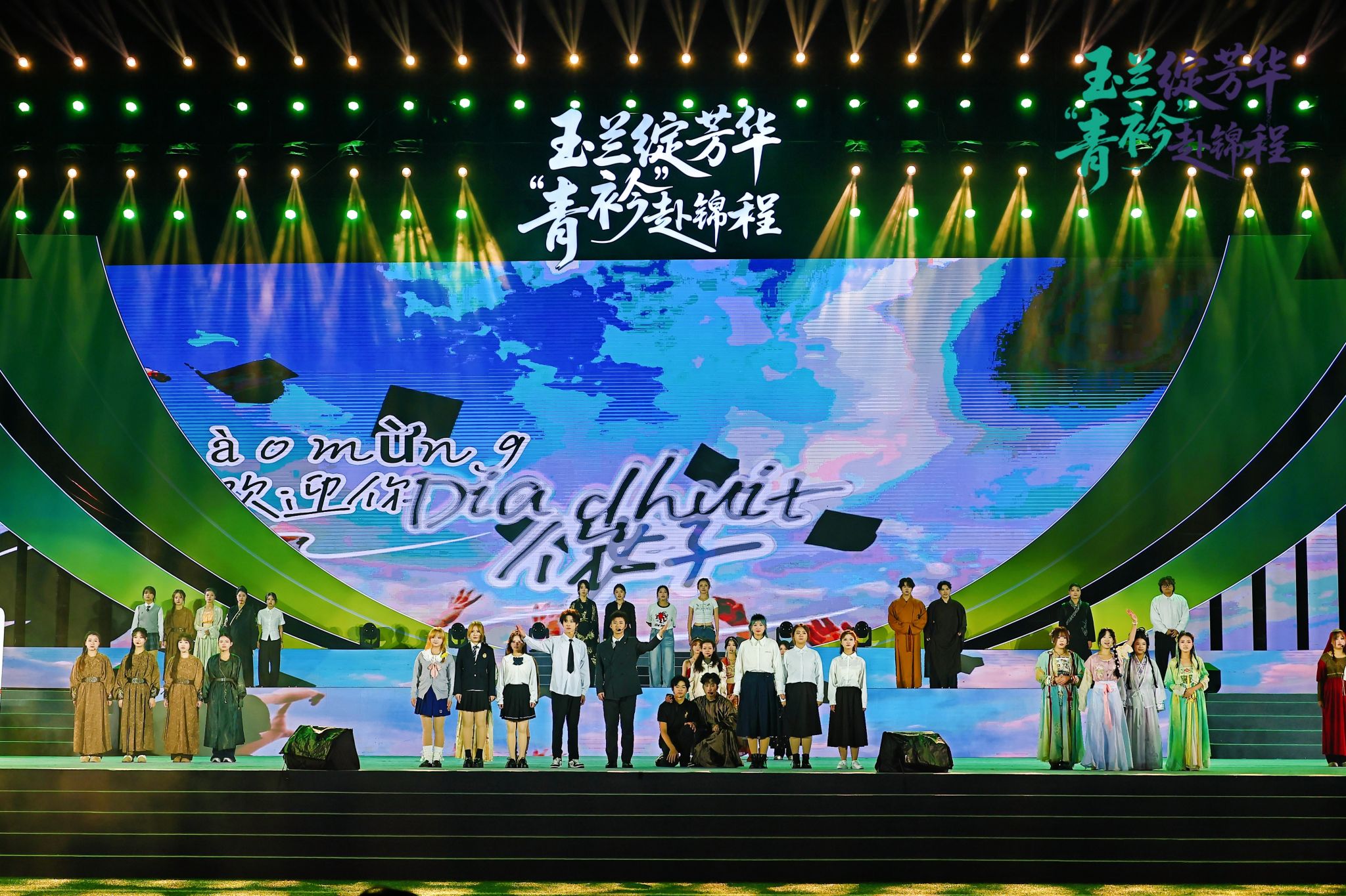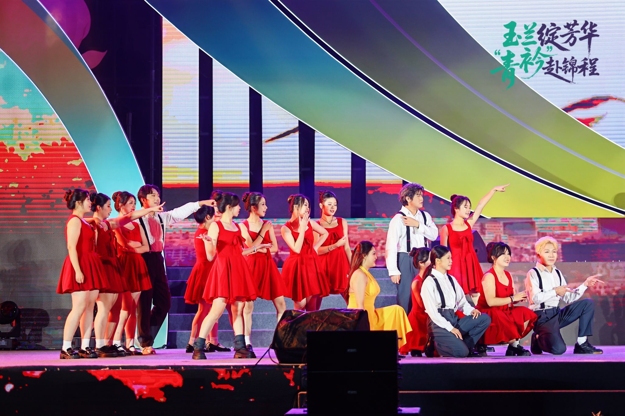 伴随着热烈掌声,晚会正式拉开帷幕。王婕副校长致辞后,音乐舞蹈学院优秀毕业生徐金航演唱的《舞狮点睛・龙的传人》,将传统民俗与青春旋律完美融合,开启“青春绽放”的序章,引导学子在传统艺术中增强文化自信;音舞教师孟宸旭深情献唱《山月下的索玛花》,温暖醇厚的歌声浸润人心,彰显艺术育人的温度与力量;校歌《经世经贸》改编的舞蹈情景剧,生动再现学校办学特色与育人初心,引发全体师生强烈情感共鸣;《岁月留声,歌声飘过六十年》歌曲联唱汇聚教师、学生、留学生多元声音,串联时代旋律与青春共鸣,展现跨文化交流中的审美交融与文明互鉴。