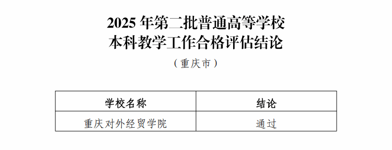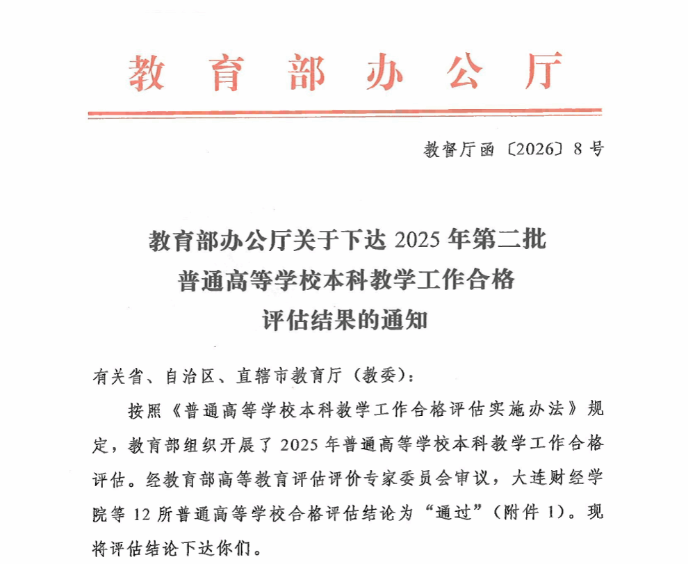 近日,教育部办公厅印发《关于下达2025年第二批普通高等学校本科教学工作合格评估结果的通知》(教督厅函〔2026〕8号)。根据专家组考察评估意见,经教育部高等教育评估评价专家委员会审议,我校本科教学工作合格评估的最终结论为“通过”。