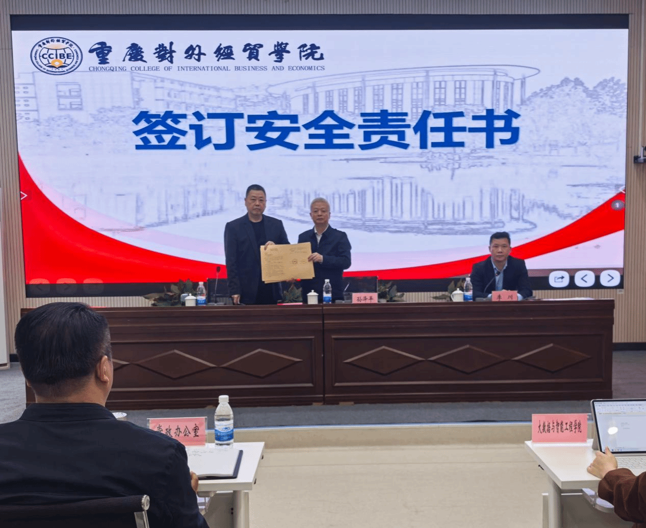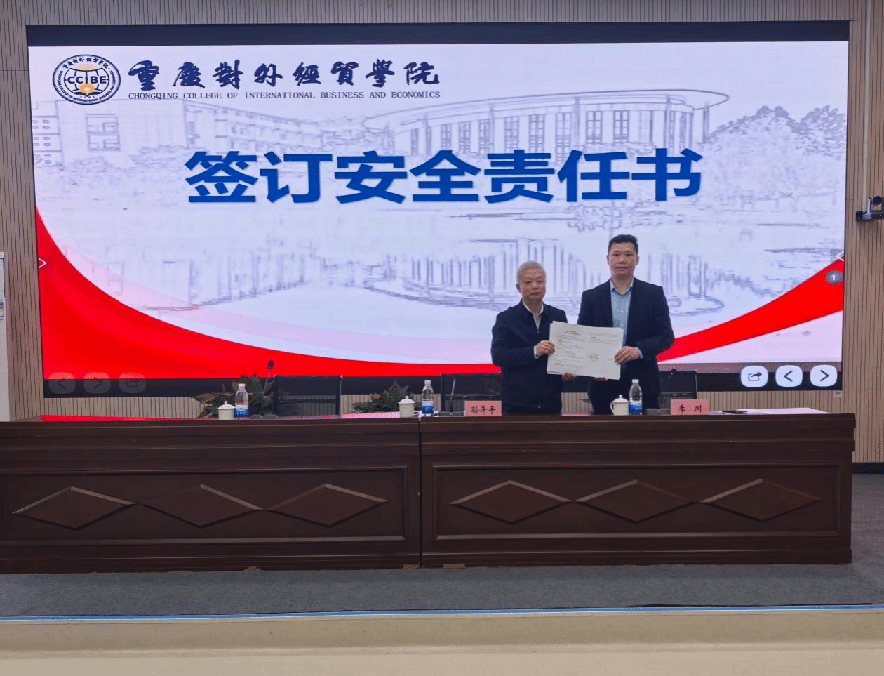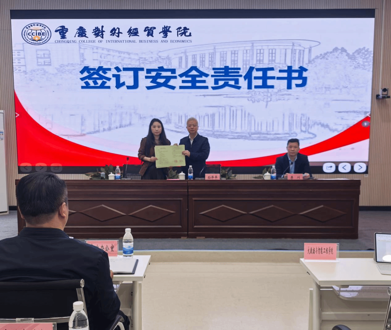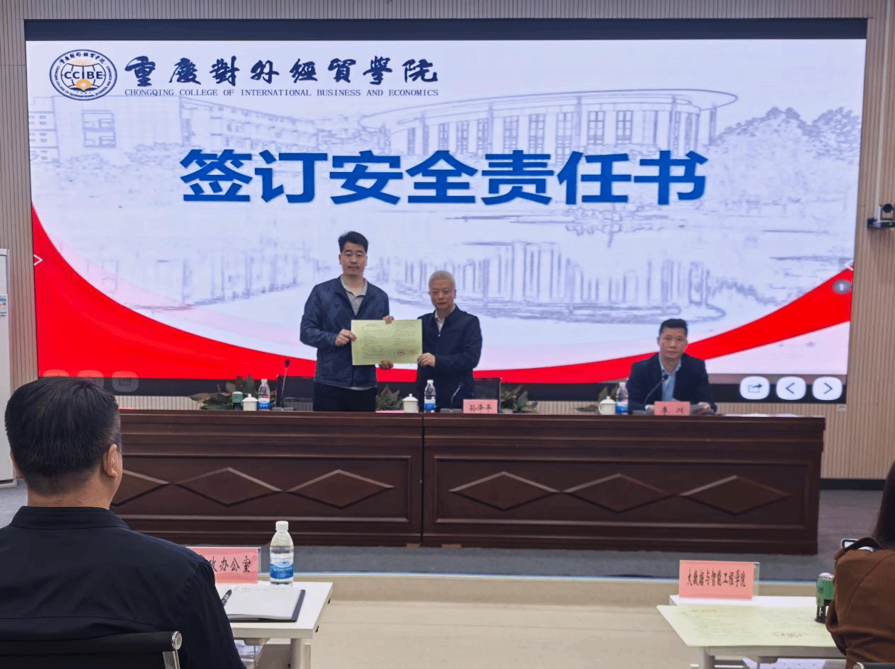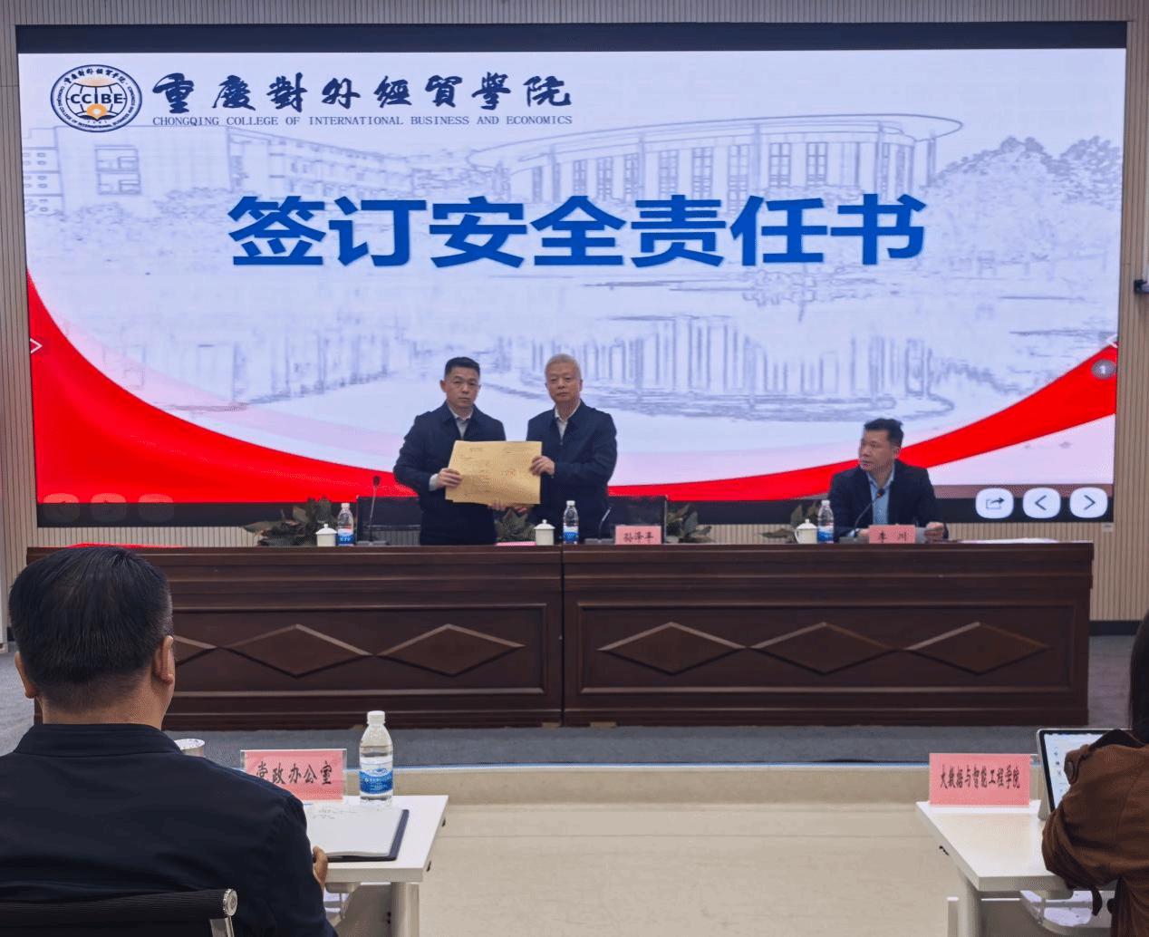 会议首先组织签订安全责任书,涵盖校领导“一岗双责”、“保安全、保稳定”及“消防安全”三类责任。会上,李川副校长作为业务分管校领导代表与孙泽平校长签订“一岗双责”分片安全管理责任书;保卫处、大数据与智能工程学院、学生处、外语外贸学院等单位代表现场签订“保安全、保稳定”及“消防安全”责任书。会议强调,责任书就是责任状、军令状,各单位须严格对照落实。