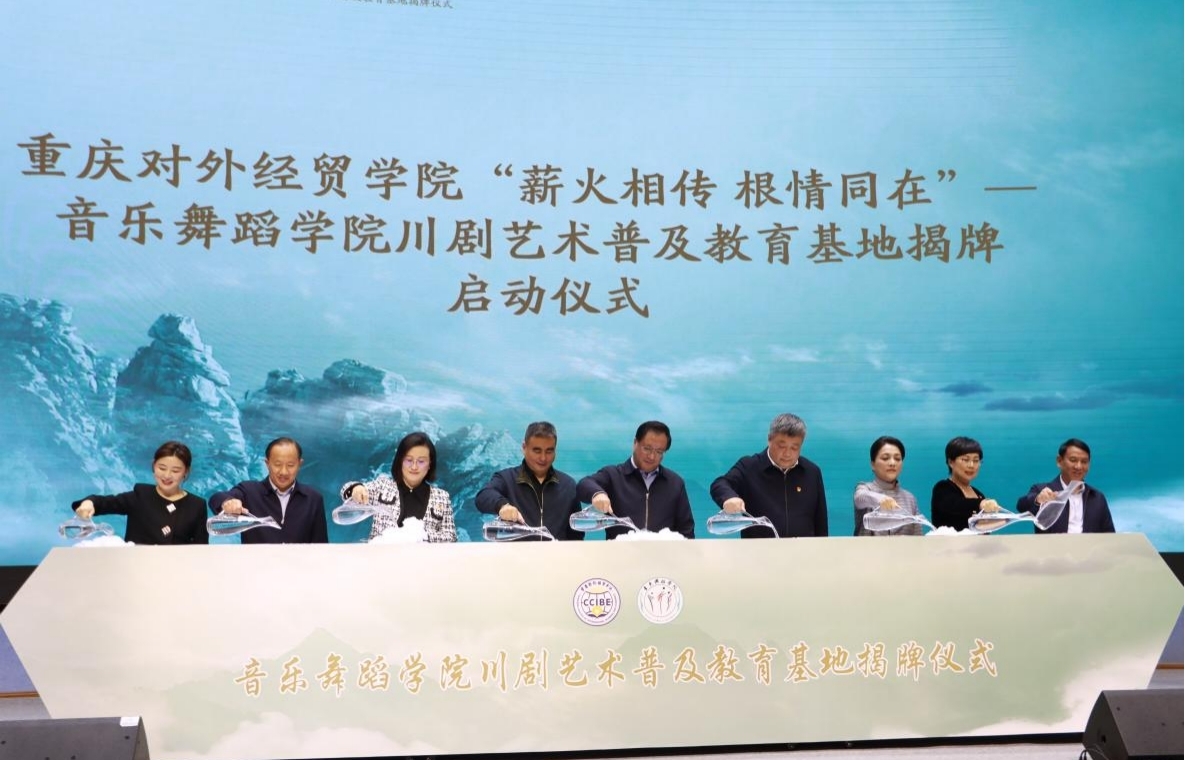 春暖花开,草长莺飞,川剧艺术与高校完美“邂逅”,共同诠释“薪火相传,根情同在”。2023年3月21日,川剧艺术普及教育基地揭牌仪式在重庆对外经贸学院隆重举行,掀起深入学习贯彻党的二十大精神、送戏进校园系列活动的新高潮,收获了十分热烈的反响。重庆市人大常委会副主任沈金强,合川区委常委、区委书记郑立伟,市文旅委一级巡视员江卫宁,区人大常委会主任程卫,市文联主席、重庆市川剧院院长沈铁梅,区政府副区长袁晓钦,区政协副主席莫智红莅临活动现场,区政府、区委宣传部、区文旅委、区文联、区社科联、区文化馆、区音协、区剧协、市文旅协会相关负责人以及郭元新理事长等相关校领导、师生代表一行出席揭牌仪式。仪式由重庆对外经贸学院音乐舞蹈学院副院长费毓珺主持。