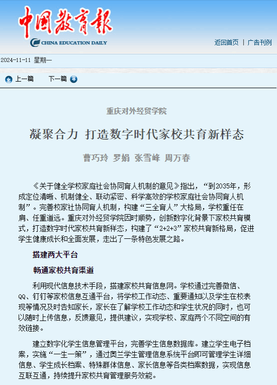 《中国教育报》报道重庆对外经贸学院 凝聚合力 打造数字时代家校共育新样态