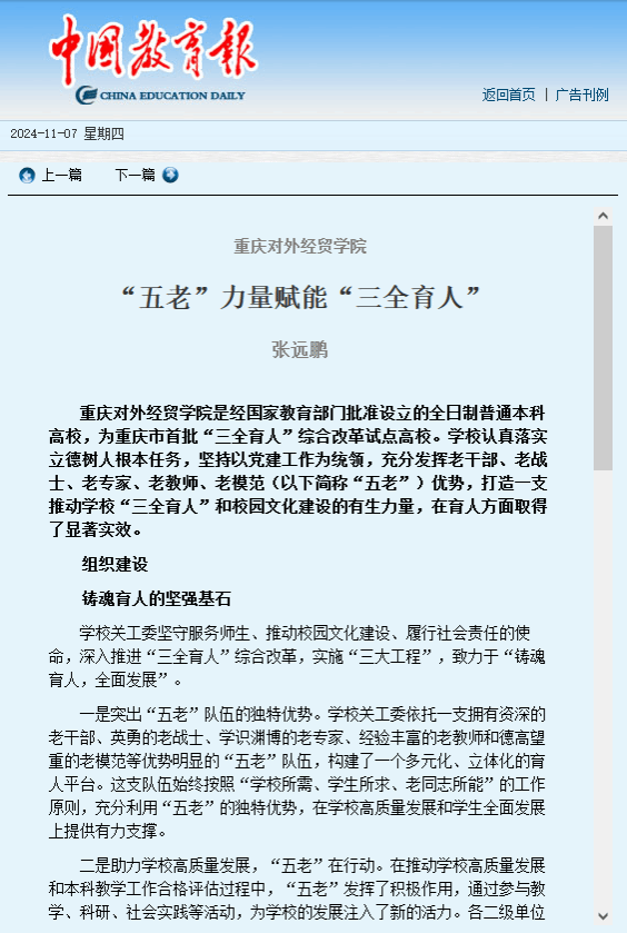 《中国教育报》报道重庆对外经贸学院 “五老”力量赋能“三全育人”