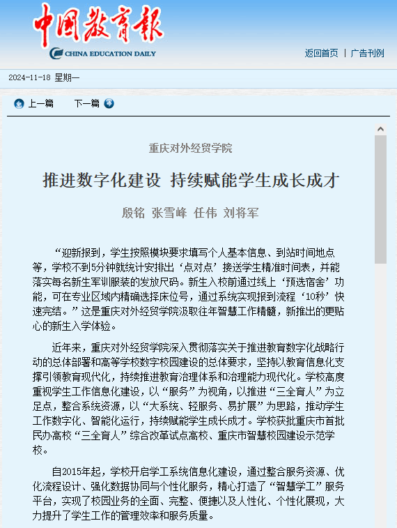 《中国教育报》报道重庆对外经贸学院推进数字化建设 持续赋能学生成长成才