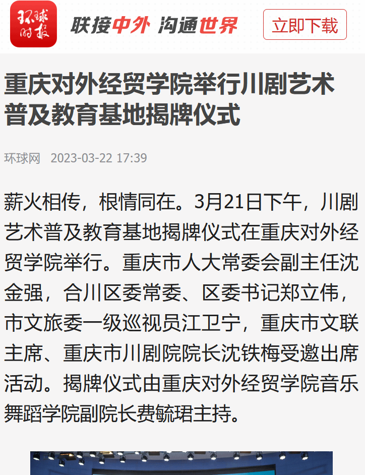 学习强国:《完美“邂逅”——川剧艺术普及教育基地揭牌仪式在重庆对外经贸学院举行》