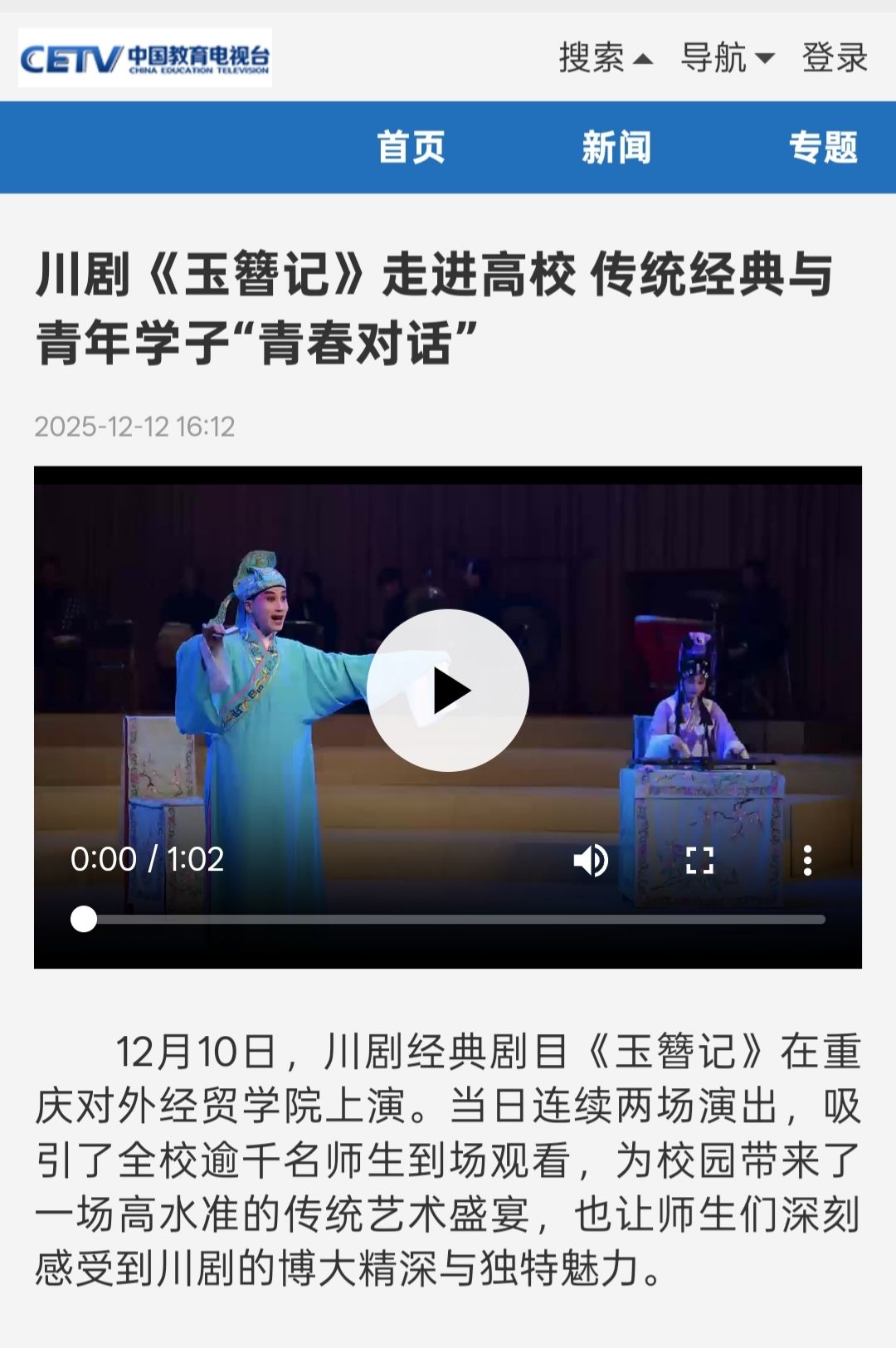 中国教育电视台报道川剧《玉簪记》走进高校 传统经典与青年学子“青春对话”