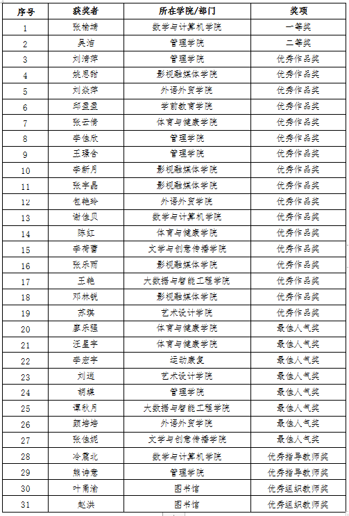 本次大赛共收到全市各大高校简历作品2100多份。在校图书馆的积极组织下,学校学生踊跃参赛,提交参赛作品488份。经大赛专家组的层层筛选、激烈评比,学校数学与计算机学院张榆靖同学荣获一等奖殊荣,管理学院吴洁荣获二等奖,其余25位同学分别荣获优秀作品奖和最佳人气奖,冷震北、熊诗意获评优秀指导教师奖,图书馆获评优秀组织奖。