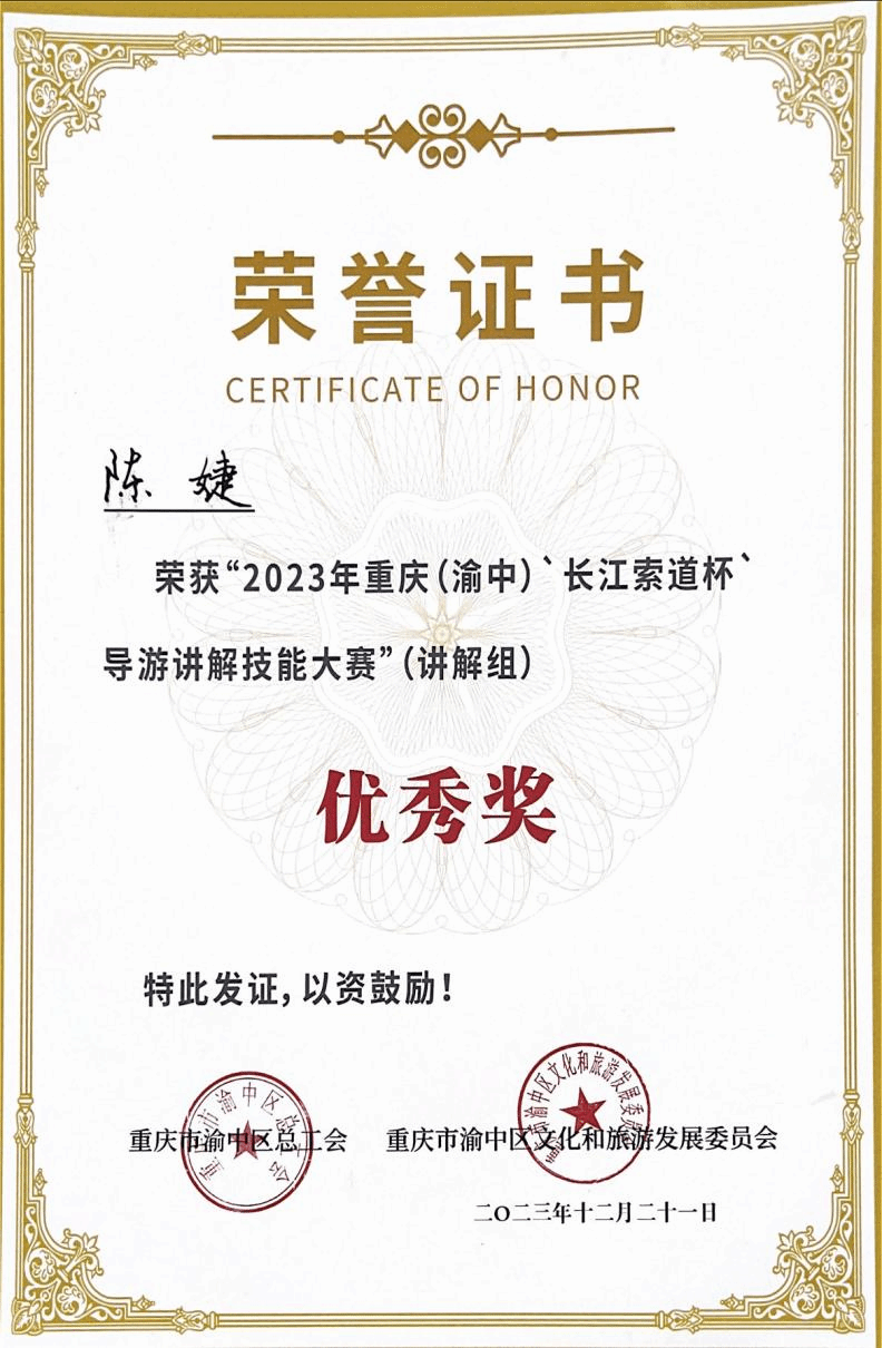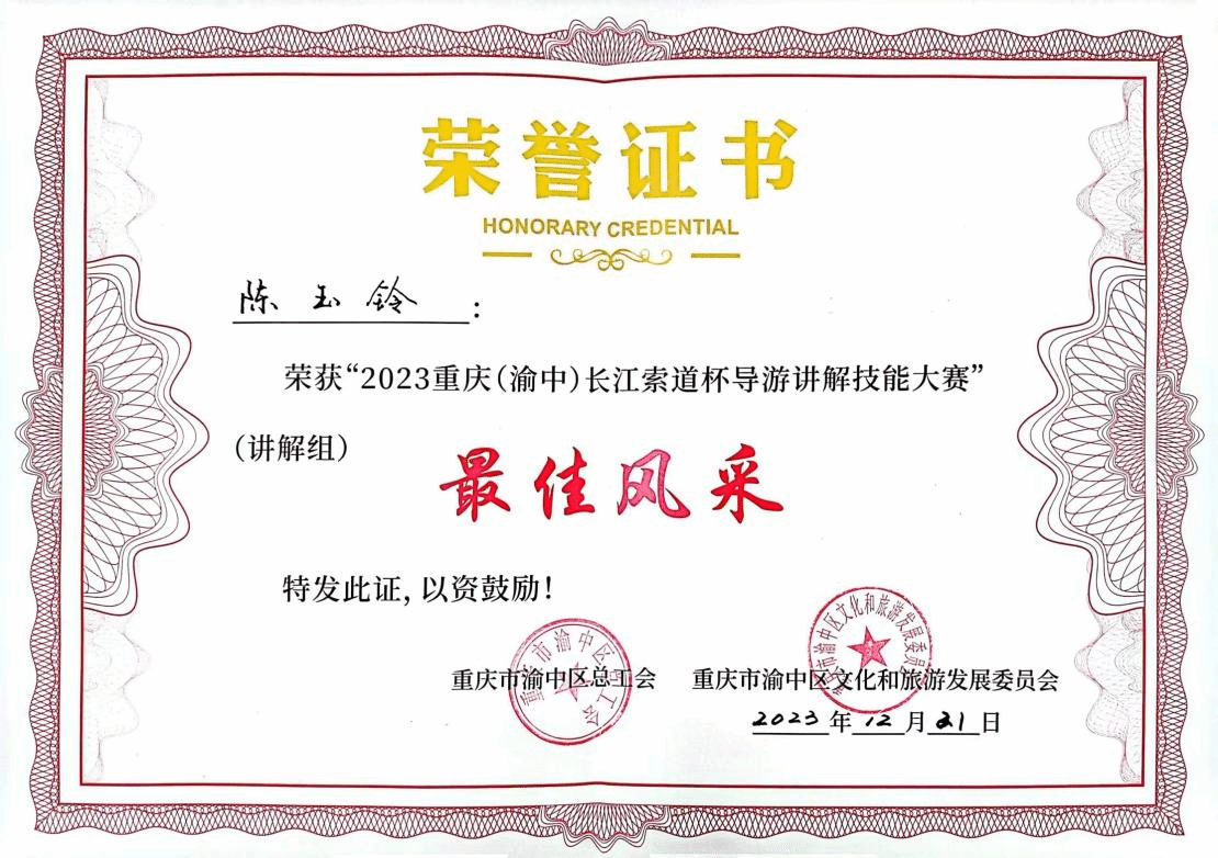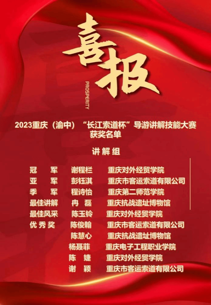 经过一周紧张严密的准备,在79名专业讲解员和各校优秀学生的复赛角逐中,谢程栏、陈玉铃和陈婕三名学生以声色并茂的讲解获得评委老师青睐,冲进赛事前十,获得参加决赛的资格。12月21日,在重庆长城酒店举行的2023重庆(渝中)“长江索道杯”导游讲解技能大赛决赛中,经过激烈刺激的比拼,学校谢程栏同学荣获大赛第一名,陈玉铃同学荣获“最佳风采奖”,陈婕同学荣获大赛“优秀奖”,重庆对外经贸学院荣获“最佳组织奖”。