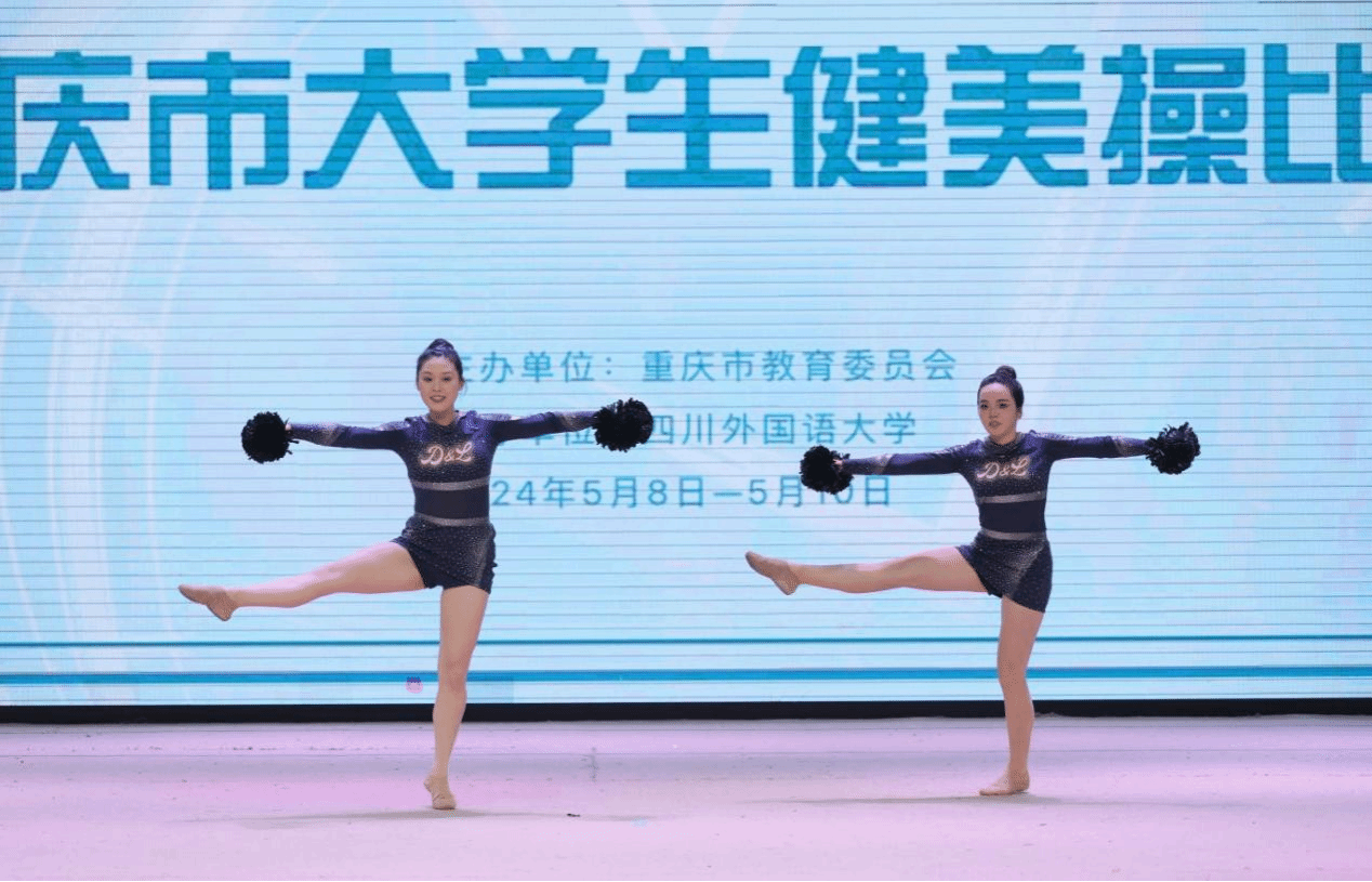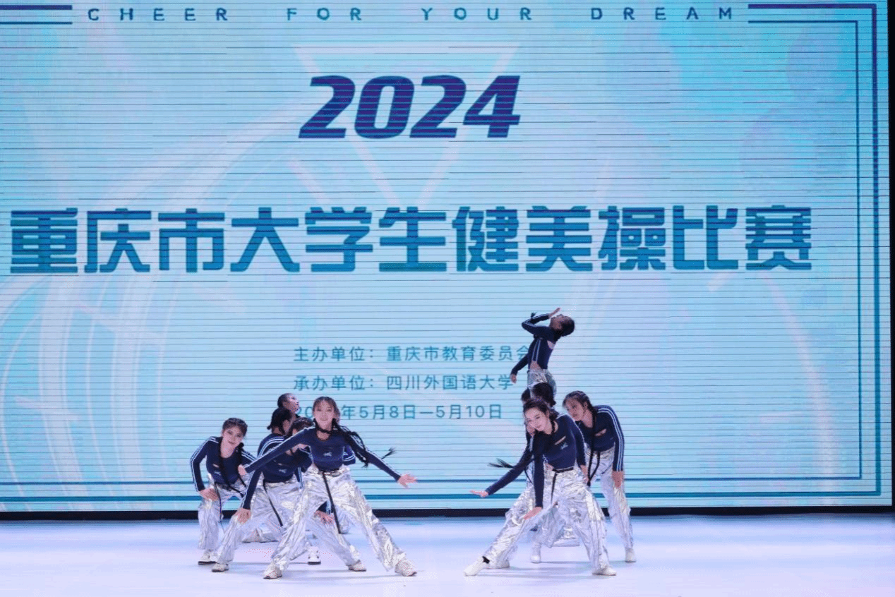 由重庆市教育委员会主办,四川外国语大学承办的2024年重庆大学生健美操比赛于5月8-10日在四川外国语大学大礼堂举行。学校派出了由校体委办公室主任、体育与健康学院副院长贾勇为领队,体育与健康学院教师谭娟、向路、邓茗丹为教练,20名学生组成的重庆对外经贸学院代表队参赛。本次比赛分为甲、乙、丙三个组别,丙组为体育专业(高水平运动队学生、体育特长生、运动系学生等)。
