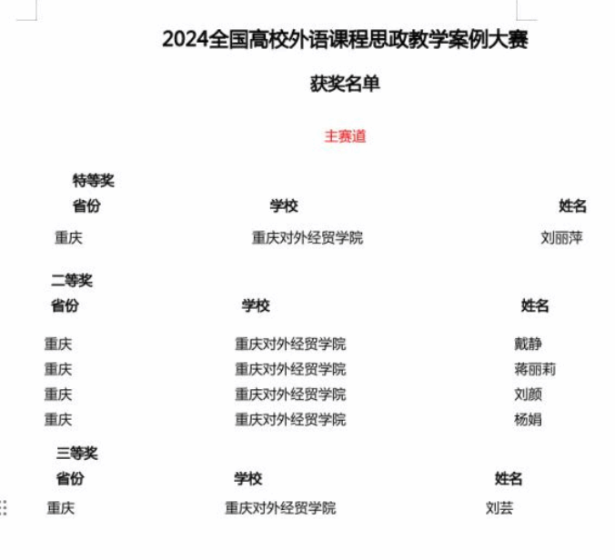 9月10日,2024年全国高校外语课程思政教学案例大赛结果揭晓,学院教师在2024年全国高校外语课程思政教学案例大赛中取得辉煌成绩!刘丽萍老师荣获特等奖;戴静、蒋丽莉、刘颜、杨娟老师荣获二等奖;刘芸老师获得三等奖。