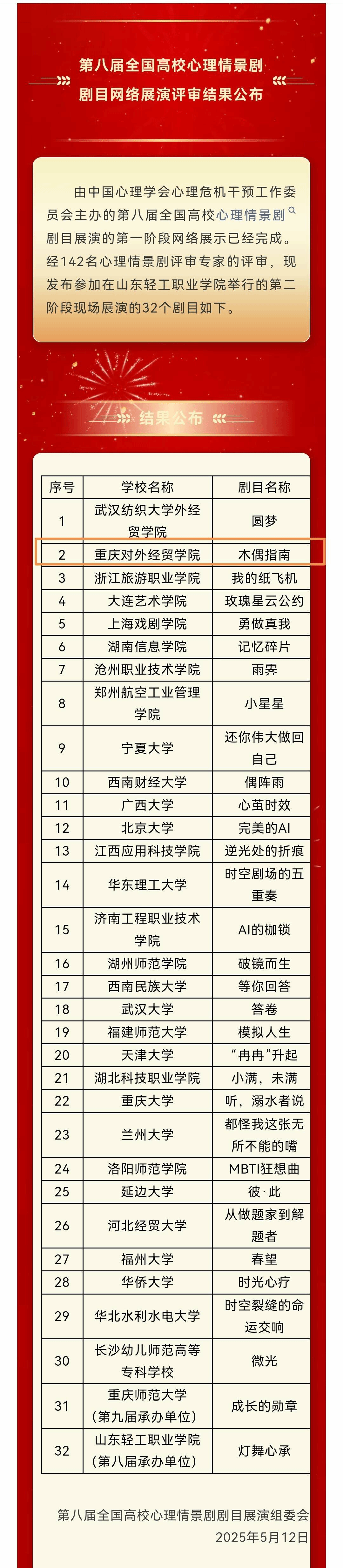 在刚刚结束的第八届全国高校心理情景剧剧目展演评选中,我校影视融媒体学院师生团队原创剧目《木偶指南》从众多优秀剧目中脱颖而出,荣获全国排名第二的好成绩,创下我校在该赛事中的历史最佳成绩!