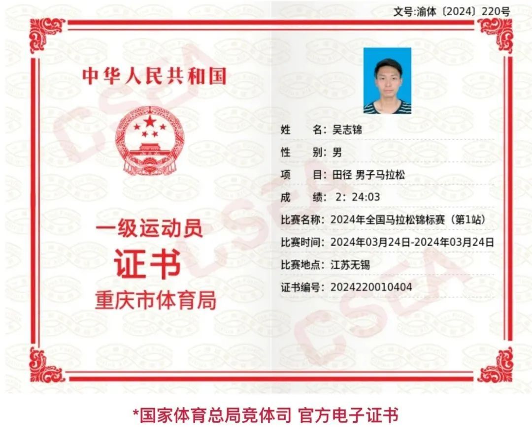 在校期间吴志锦便展现出非凡的体育天赋,多次打破校运会800米、1500米、3000米长跑纪录,重庆大学生运动会5000米冠军,是校园体育赛场上的明星选手。毕业后,仍坚持高强度训练,成功晋升为国家一级运动员,在各大赛事中屡获佳绩。此次马拉松比赛高手云集,凭借科学的配速策略和强大的耐力储备,从起跑便保持领先,最终以优异成绩冲过终点。