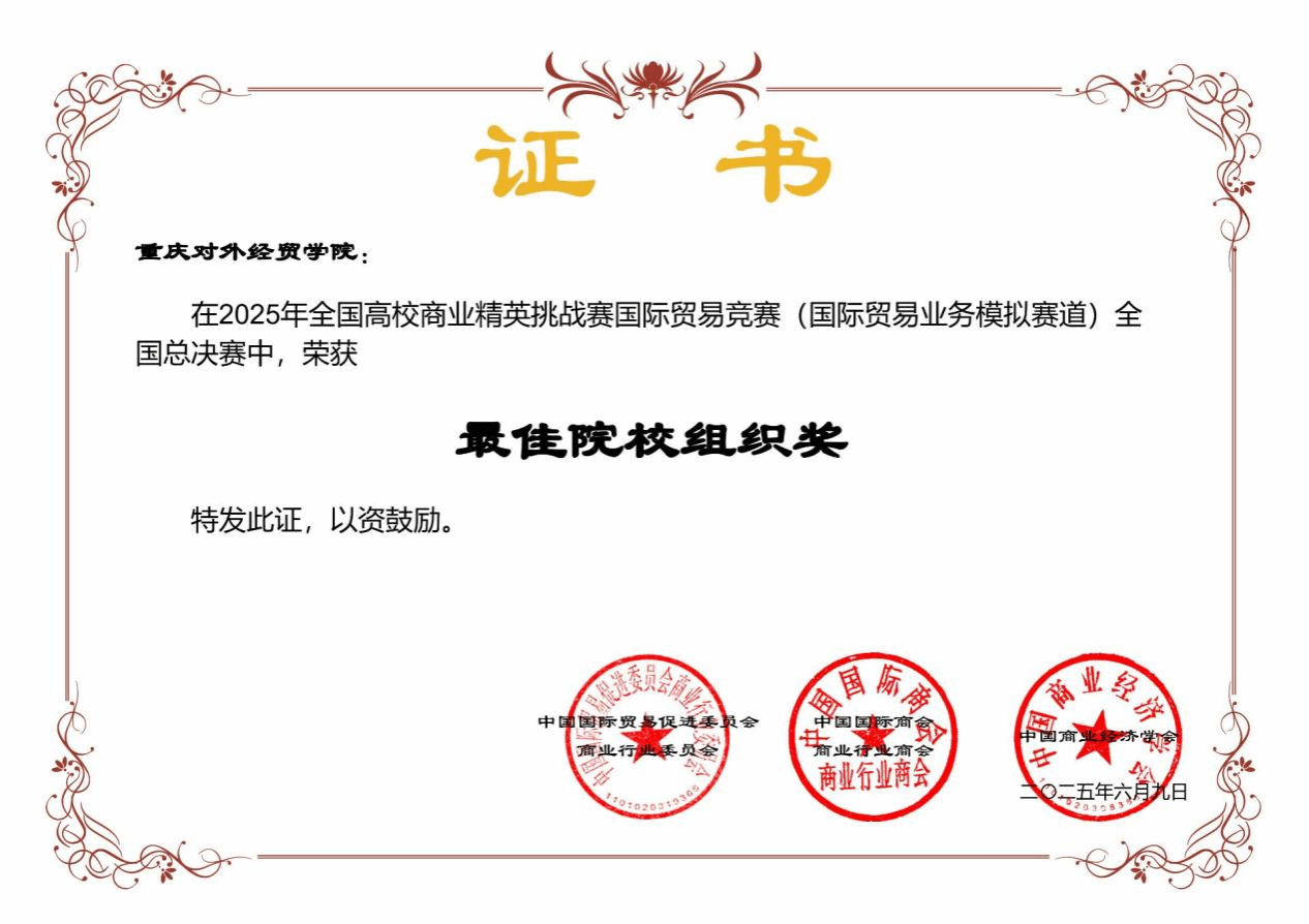 【本网讯】6月5日至6月9日,第十五届全国高校商业精英挑战赛国际贸易竞赛在宁波国际会展中心7号馆隆重举行。本届赛事由中国国际贸易促进委员会商业行业委员会主办,吸引全国198所高校的408支队伍、逾3300名师生同场竞技。我校由跨境商务学院牵头组建的2支代表队,历经八个月的备战,最终斩获全国一等奖1项、二等奖1项及最佳院校组织奖1项,创下我校在该项国家级B类学科竞赛中的最佳战绩。