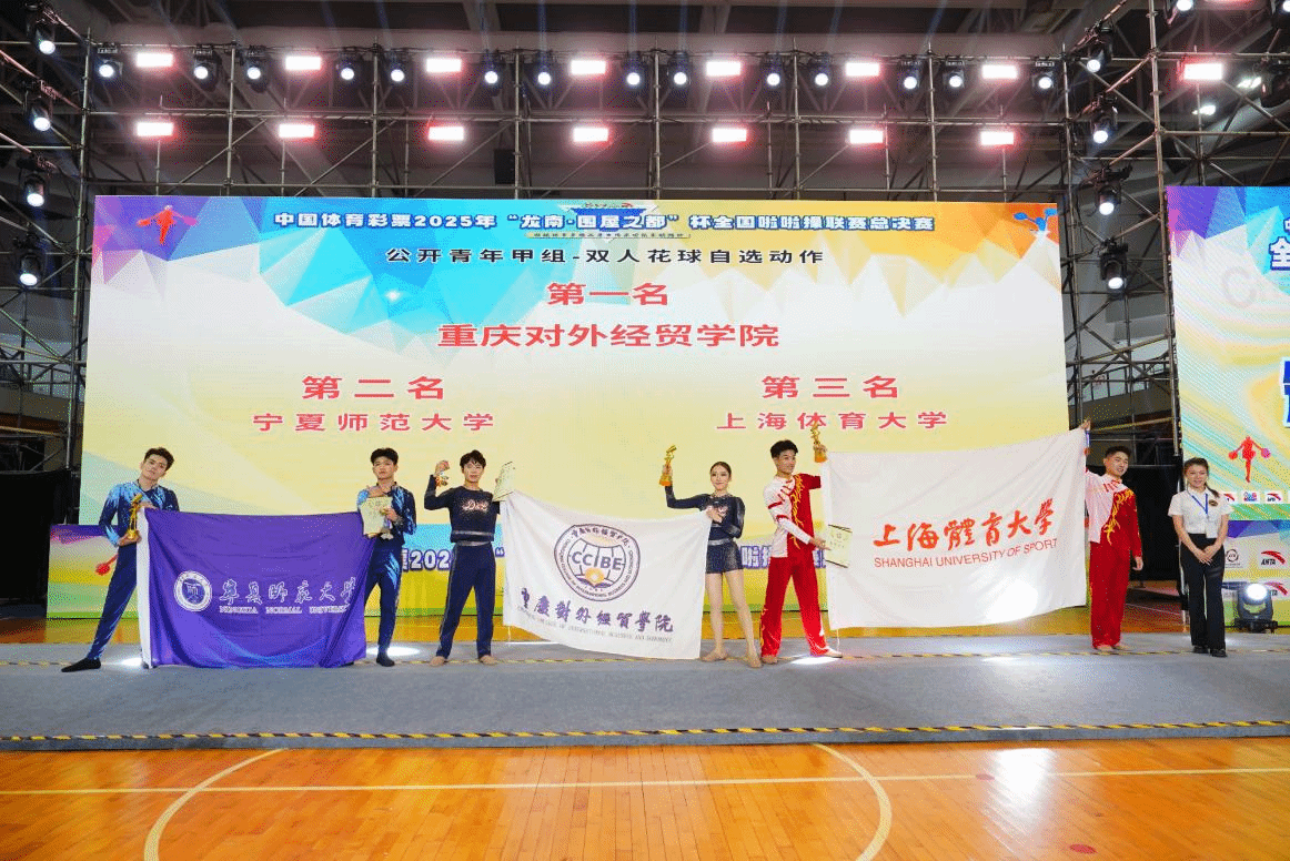 【本网讯】由国家体育总局体操中心主办,江西省赣州市承办的2025年全国啦啦操总决赛于2025年7月21-24日在江西省赣州市龙南体育馆举行。为了提高我校在全国高校中的影响力,更好地提高整个队伍的竞技水平,锻炼学生的舞台经验。在校体委的领导下,校体委决定将校啦啦操队伍中的双人花球推向全国,由体育与健康学院副院长贾勇为领队,体育与健康学院教师邓茗丹为教练,由重庆市大学生健美操比赛双人花球冠军代表学校参加本次比赛。本次比赛分为公开青年甲组(体育院系及艺术院系组)、公开青年乙组(普通院校)、公开青年丙组(高职高专)三个组别。