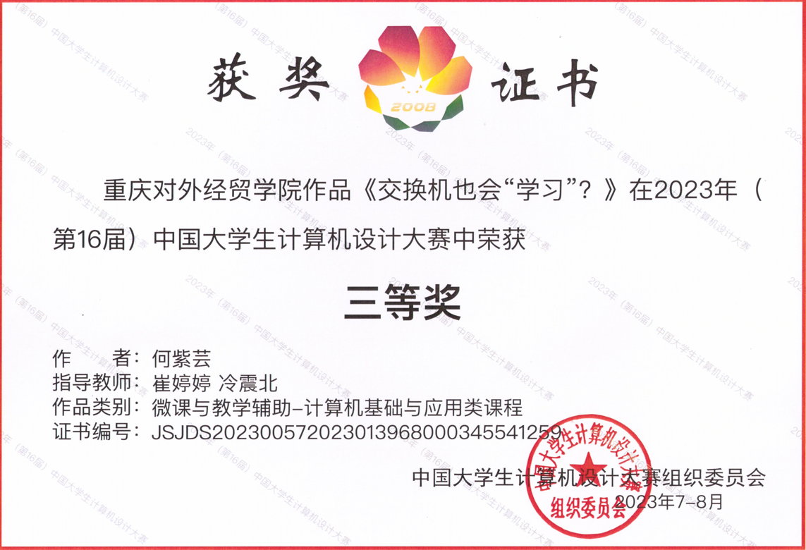 2023年(第16届)中国大学生计算机设计大赛“微课与教学辅助类”的决赛分别在东北大学落下帷幕,学校共有3支队伍参加比赛;最终,1支队伍获得全国二等奖,2支队伍获得全国三等奖。