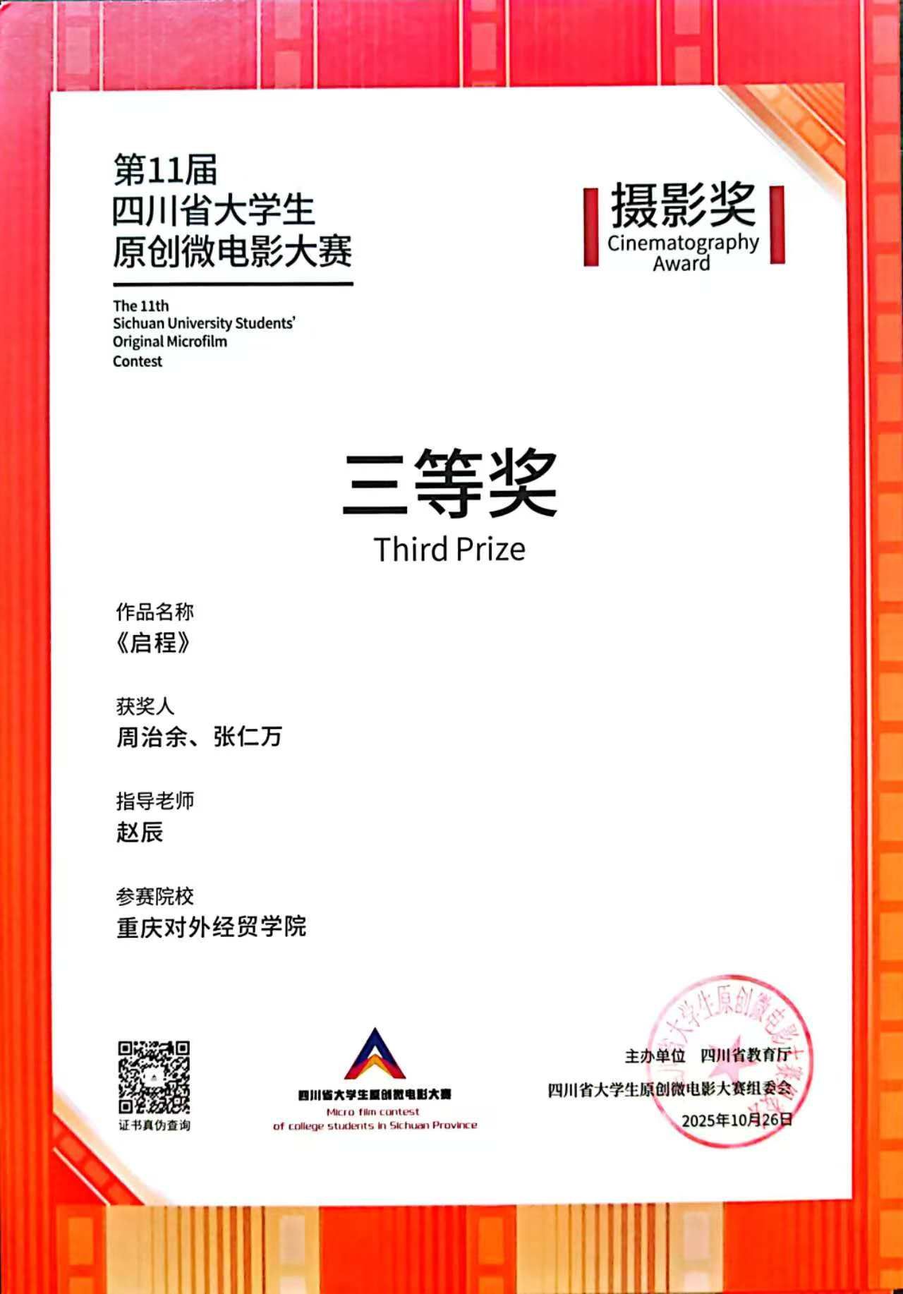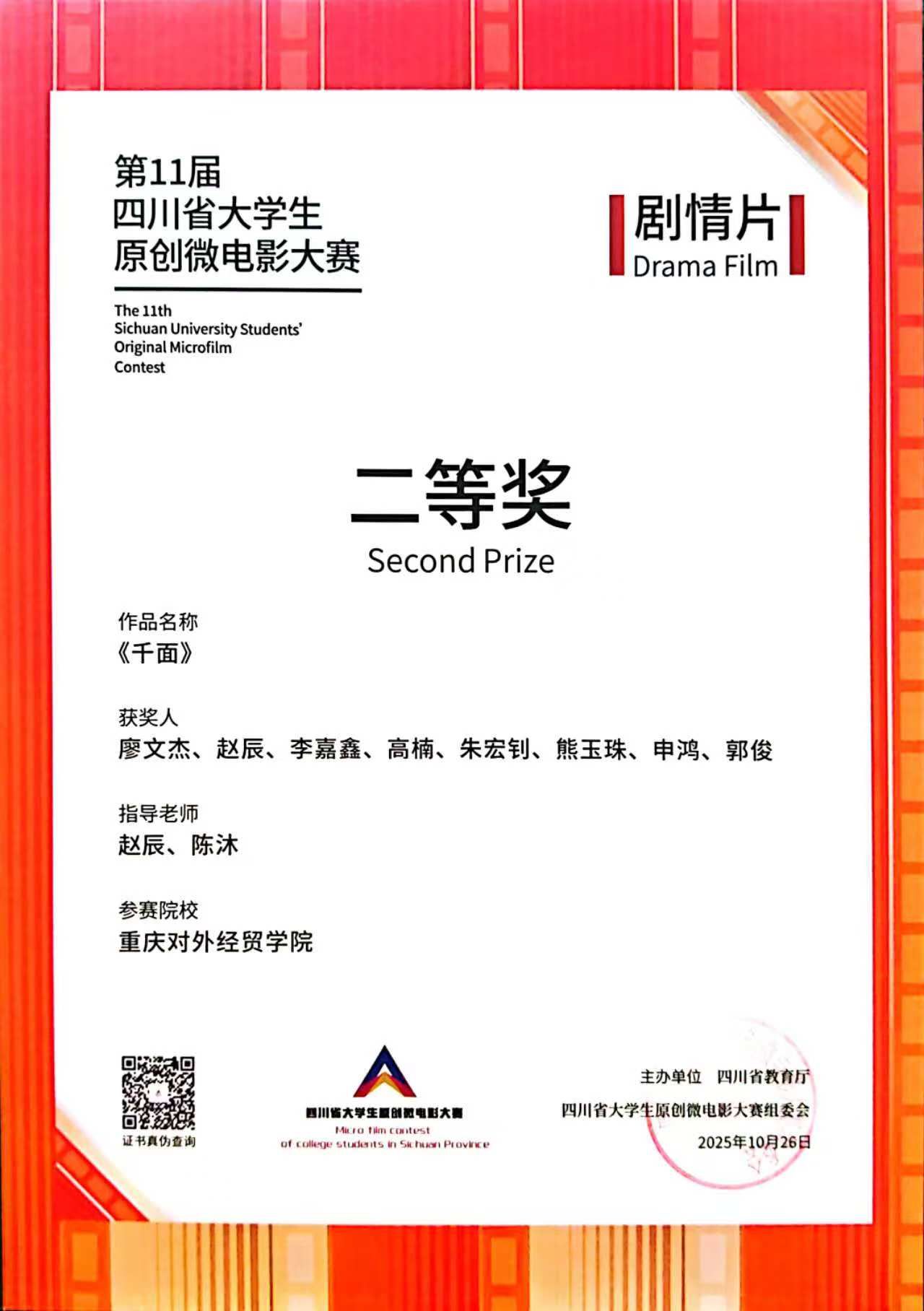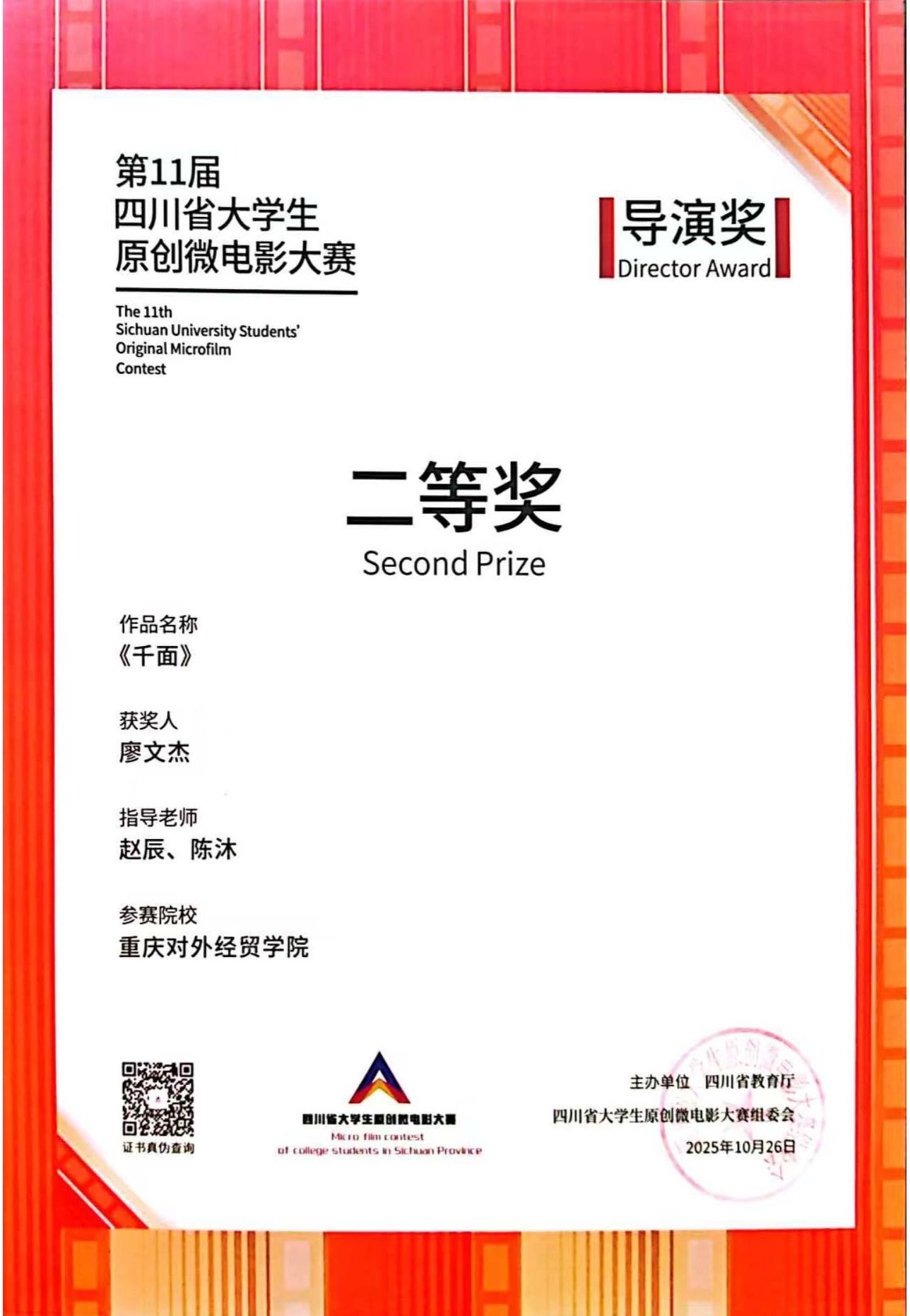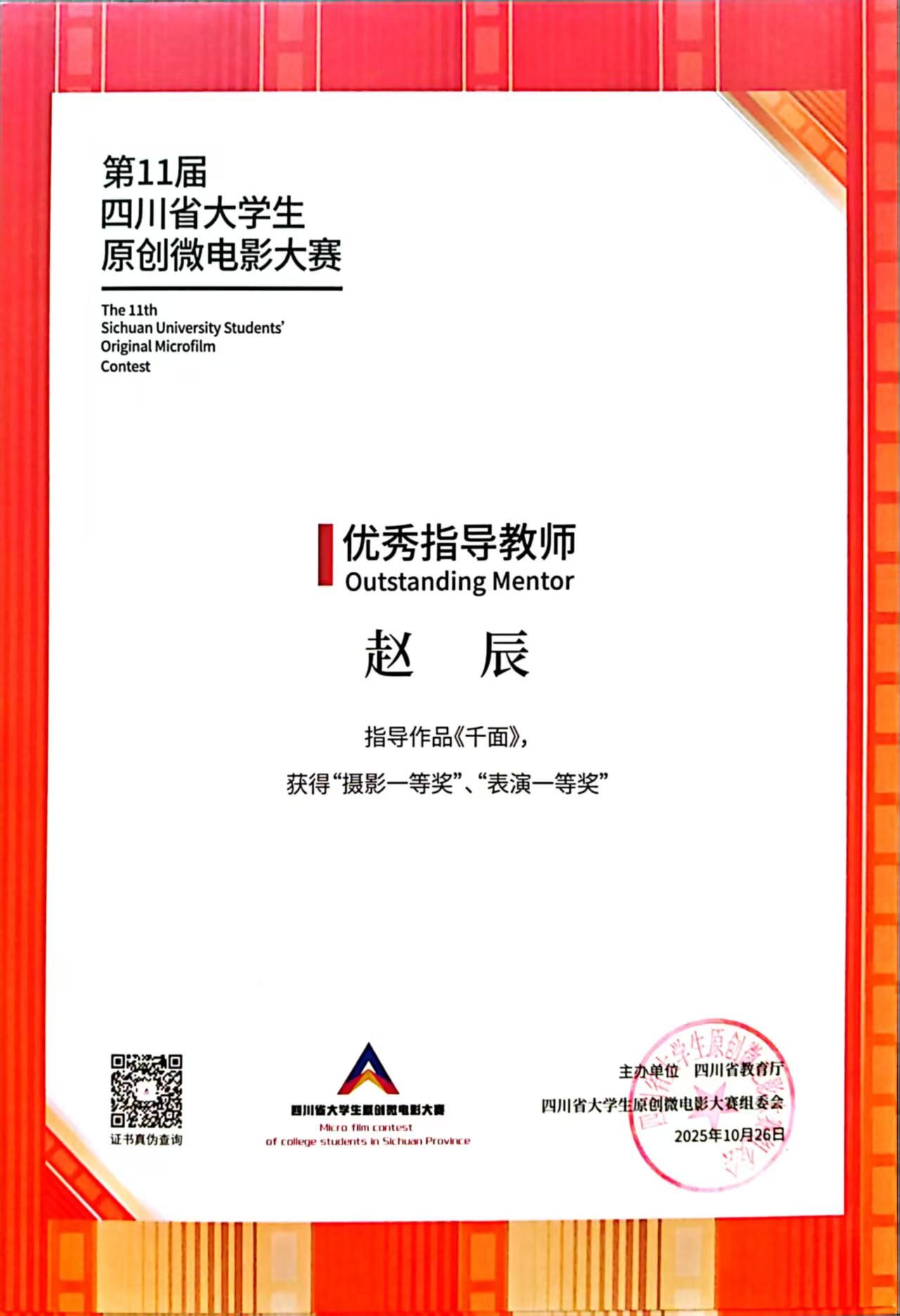 近日,由四川省教育厅主办的2025年(第十一届)四川省大学生原创微电影大赛获奖名单正式公布获奖名单。影视融媒体学院学子的作品从全国及海外67所高校的477部决赛作品中脱颖而出,一举斩获12项单项荣誉,涵盖剧情片、导演奖、摄影奖、剪辑奖、表演奖五大类别。学校荣获“优秀组织奖”,教师赵辰、陈沐获评“优秀指导教师”。