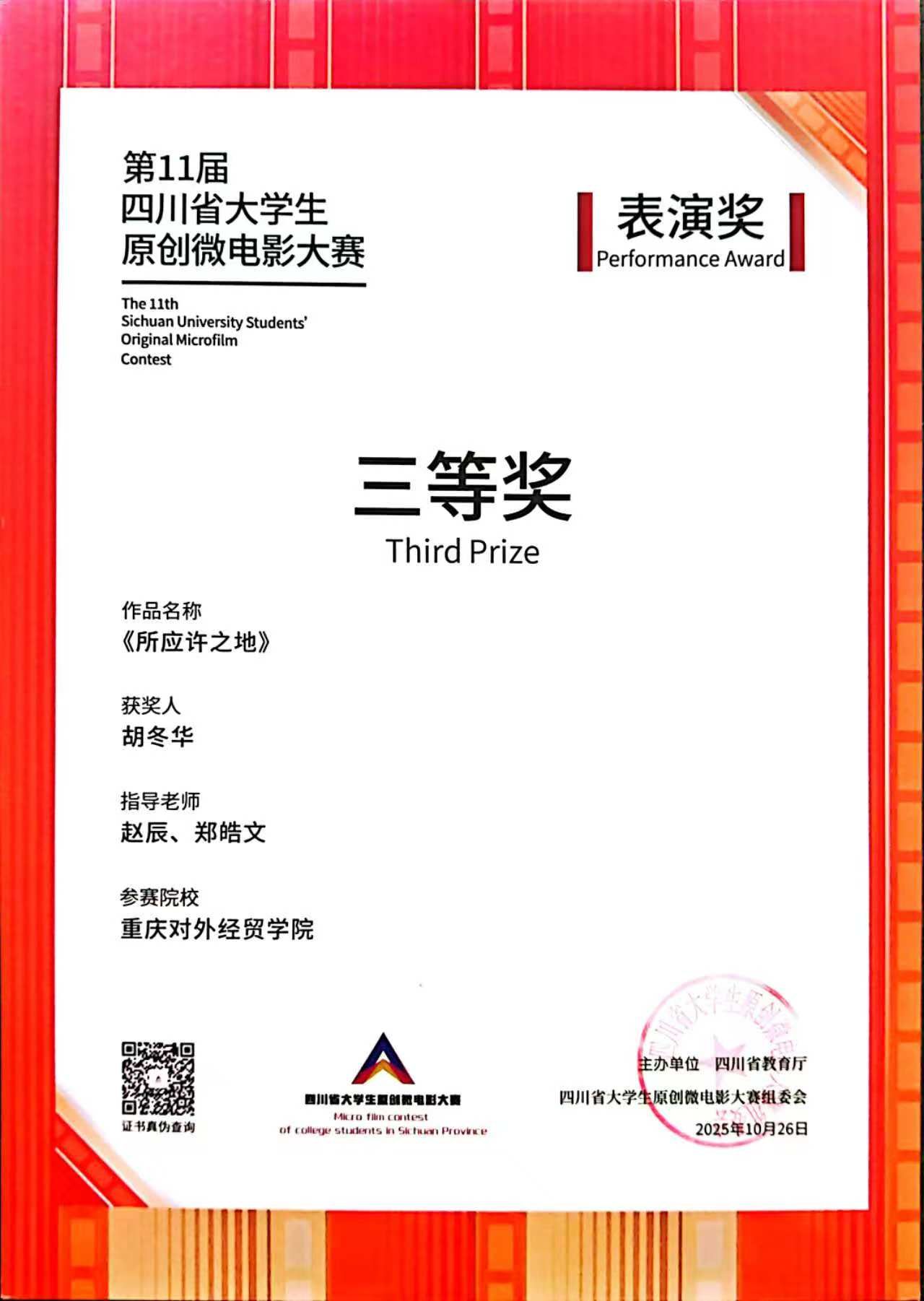 《所应许之地》主演胡冬华获三等奖(指导教师:赵辰、郑皓文)