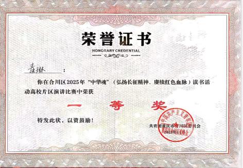 近日,在合川区“中华魂”(弘扬长征精神、赓续红色血脉)读书活动演讲比赛中,我校影视融媒体学院2025级播音与主持艺术专业的秦琳同学,在本次比赛中凭借优秀的专业能力与精湛的主题表达,脱颖而出,以高校组一等奖和青年组金奖的好成绩,一举获得代表合川区晋级市赛的入场券!