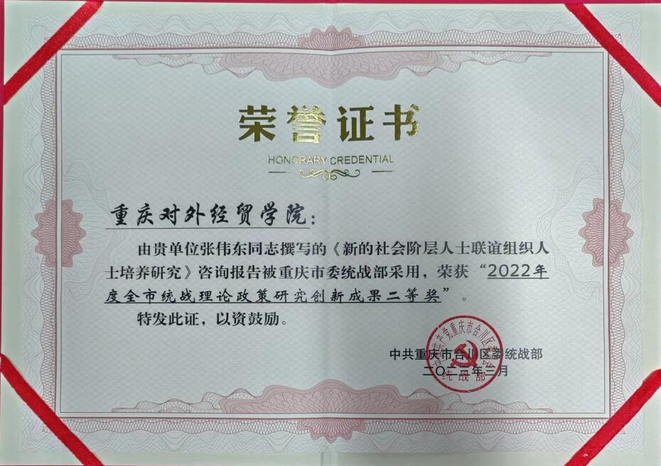 近日,中共重庆市委统战部《关于2022年度全市统战理论政策研究创新成果的通报》(〔2023〕第2期),由学校校企合作服务中心主任、合川区政协委员张伟东同志执笔撰写的《新的社会阶层人士联谊组织人士培养研究咨询报告》经中共合川区委统战部推荐被中共重庆市委统战部采用,并在2022年度全市战理论政策研究评选活动中荣获“创新成果二等奖”。这是学校撰写的咨询报告首次被市委部门采用并在全市统战理论政策研究领域中获此殊荣。