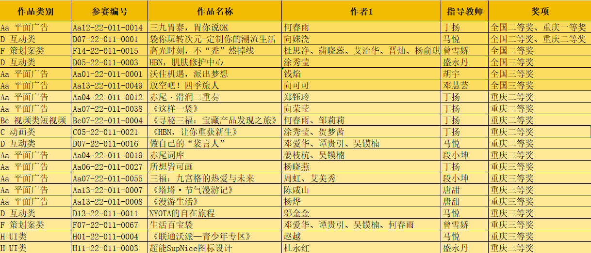大广赛作为全国规模最大、覆盖最广、影响力最深的高校广告艺术赛事,是检验高校设计类专业教学质量与学生实践能力的重要平台。我校学子凭精准创意与精良设计突围,其中何春雨作品《三九胃泰,胃你说OK》、向姝浇作品《袋你玩转次元》等3件作品获全国二等奖,丁扬、马悦、曾雪娇等教师获优秀指导奖。