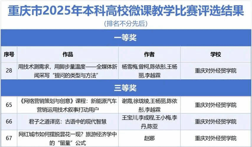 在重庆市2025年本科高校微课教学比赛中,我校教师团队表现优异、成果突出,取得了一等奖1项、三等奖3项的优异成绩,充分展示了我校教师扎实的教学功底、突出的教学创新能力和良好的数字化教学素养。