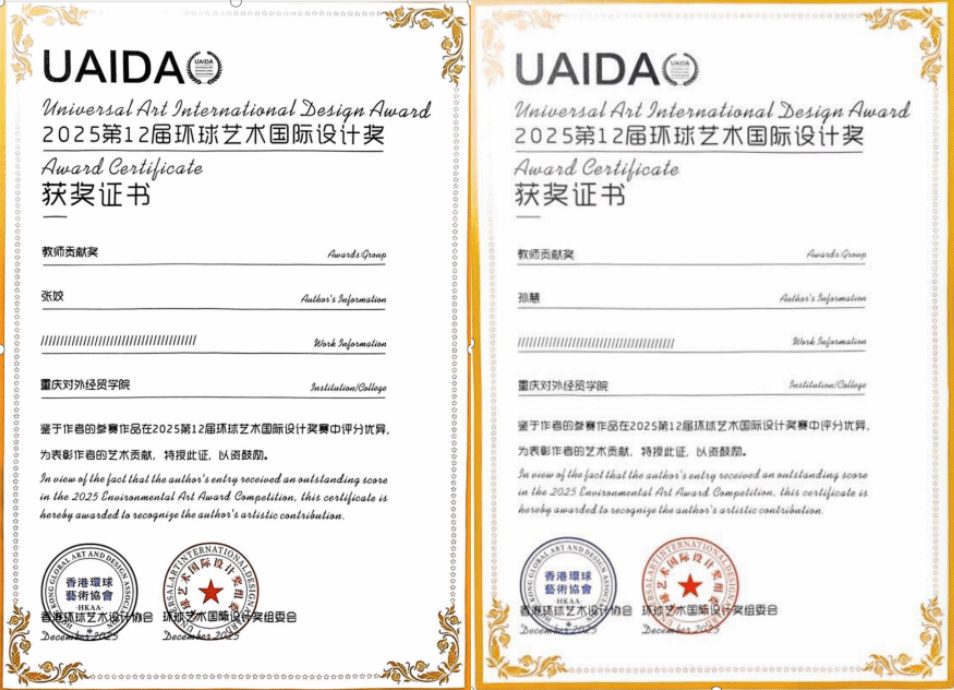 近日,2025第12届环球艺术国际设计奖评选结果揭晓,重庆对外经贸学院艺术设计学院环境设计专业师生表现亮眼,斩获多项荣誉。
