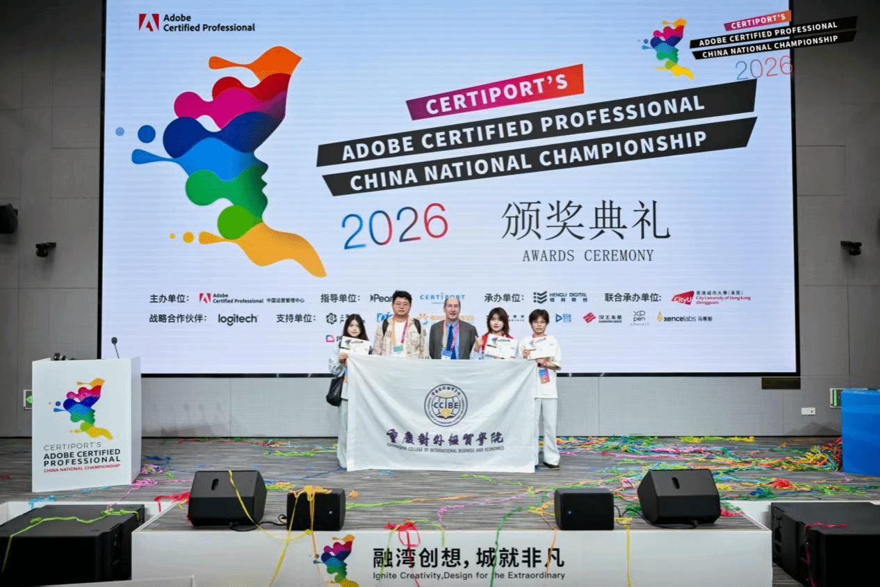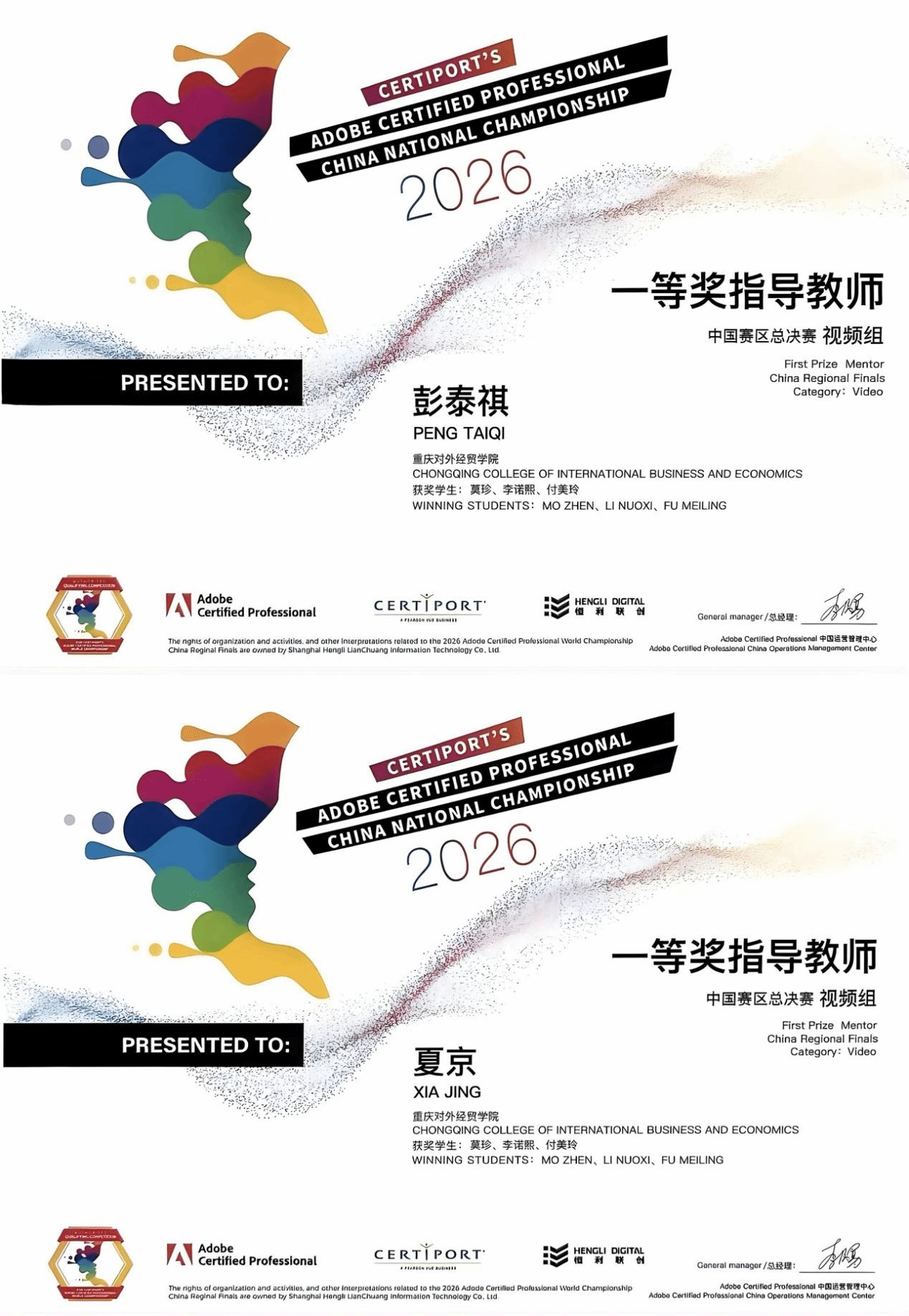 4月26日,2026 Adobe Certified Professional(ACP)世界大赛中国赛区总决赛圆满落幕,由影视融媒体学院数字媒体技术专业教师彭泰祺、夏京共同指导,2025级数字媒体技术专业学生莫珍、李诺熙、付美玲创作的视频作品《遨游合川》,荣获 2026 Adobe Certified Professional(ACP)世界大赛中国赛区总决赛视频组一等奖,指导教师彭泰祺、夏京荣获一等奖指导教师!