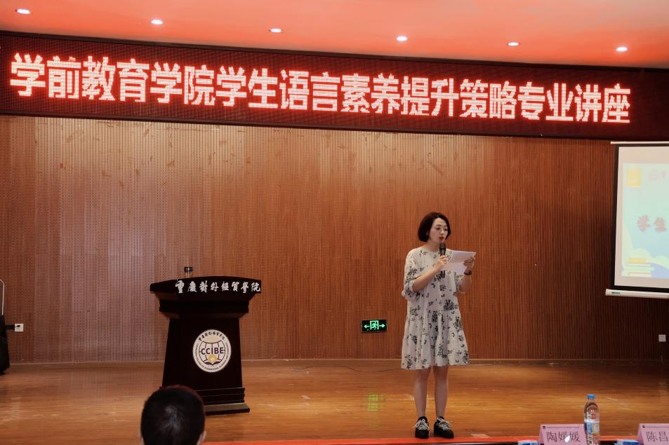 为提升学院全体学生的语言素养,加强学生对朗诵、演讲技能的掌握,用更专业的方法为同学们分享提升语言素养的经验,以全方面、多角度讲授专业知识,重庆对外经贸学院学前教育学院于2023年6月1日15:00-16:00在铜梁校区学术报告厅开展学生语言素养提升策略专业讲座。本次讲座邀请到铜梁区朗诵艺术家学会会员、理事,重庆市音乐家协会会员,铜梁中学播音主持专业专职教师陈昌云主讲,学院党总支书记陶媛媛、团总支书记王小琴出席本次讲座,2022级全体学生参与本次讲座。