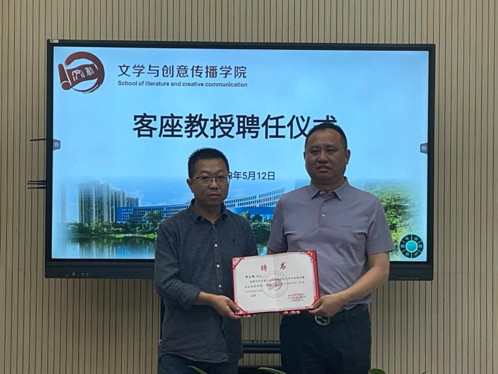 重庆对外经贸学院文学与创意传播学院于5月12日下午,在第九教学楼9104教室举行实践教学基地签约授牌暨客座教授聘任仪式。出席本次仪式的嘉宾有:涪陵第四中学校副校长卢晓清,涪陵第十九中学校副校长钟玉翔,奔行研学公司总经理余建军,重庆对外经贸学院教务处副处长彭高中,文学与创意传播学院党总支书记、代理院长何杨波,副院长陈寿琴,实践教学管理科科长郭峻辰,以及学院其他老师。本次授牌仪式由文学与创意传播学院代理院长何杨波主持。