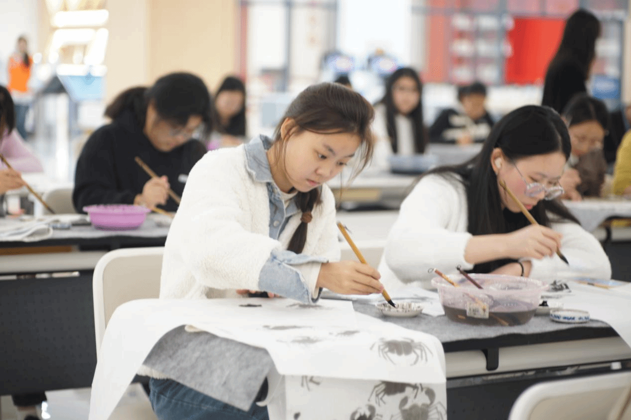 紧随其后的“墨韵图书馆·丹青绘美景”国画教学活动中,师生以“蟹”为题共绘水墨意境。从笔墨纸砚的基础知识到绘画技法的逐步解析,参与者在创作中感受中国画的写意精神,图书馆空间也在笔墨交错中转化为传统美育的实践课堂,进一步拓展了文化服务的内涵。