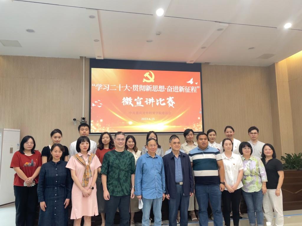 为进一步推动学习贯彻习近平新时代中国特色社会主义思想主题教育深入开展,深学笃行习近平总书记关于青年工作的重要思想,6月15日,由校党委组织部、马克思主义学院、外语外贸学院承办的“学习二十大·贯彻新思想·奋进新征程”微宣讲比赛在9106会议室开展。马克思主义学院刘康、王顺达、李亚军、王开敬、尹艳五位老师担任评委,经各二级学院党总支初赛评选,共有12名党支部书记进入决赛。各位参赛选手按照赛前抽签顺序,依次上台宣讲。