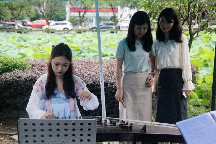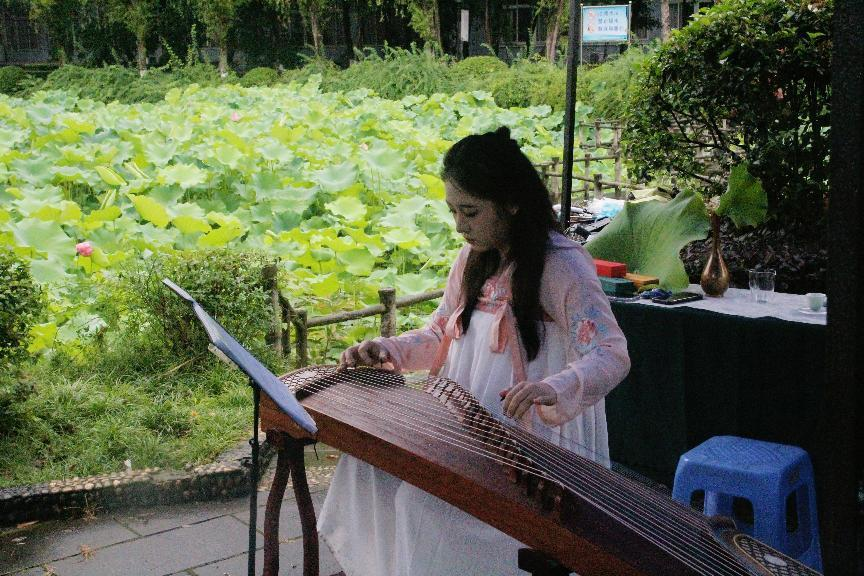 活动伊始,来自音乐与舞蹈学院的两位表演者身着汉装,为大家弹奏了《大鱼》《女儿情》《蒹葭》等古筝曲,在淅淅的小雨中听着悠扬的古筝曲,为茶会活动增添了古风韵味。
