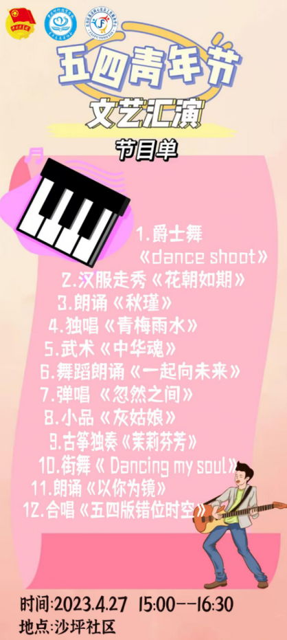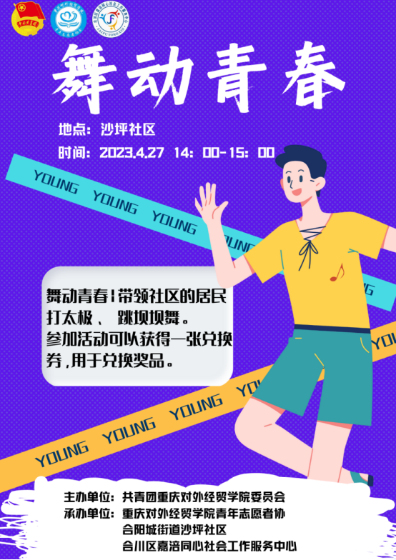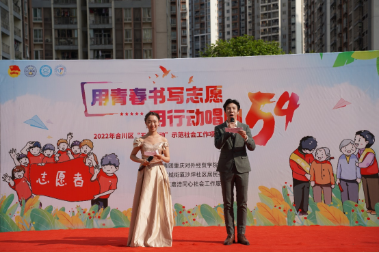 为深入学习贯彻习近平新时代中国特色社会主义思想,传承红色文化和革命精神,引导和帮助广大青年学生在社会课堂中受教育、长才干、做贡献,重庆对外经贸学院联合合阳城街道、合川区嘉涪同心社会工作服务中心在合川区沙坪社区顺利开展“五四”青年节主题活动。此次活动共计152名志愿者参与其中,设置红色游园会特色志愿服务摊位6个,文艺汇演节目12个,社区的所有居民到场并参与活动,直播在线观看人数达700人次。