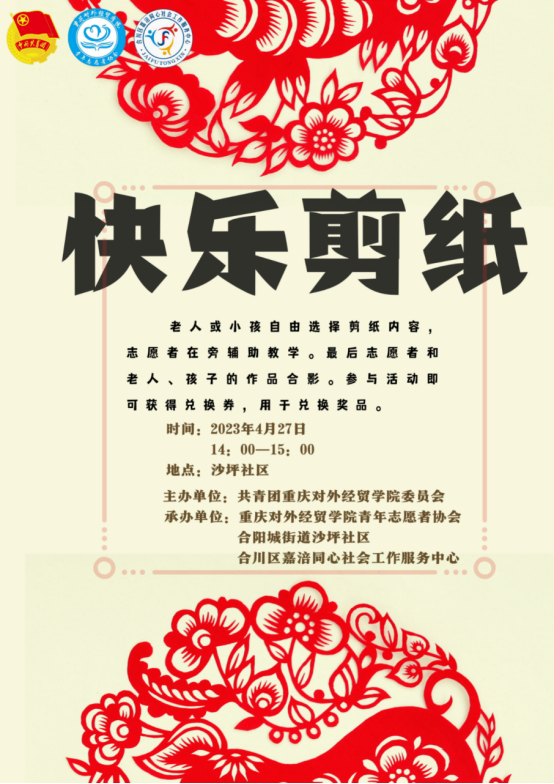 “快乐剪纸”:剪纸是一种民间艺术,志愿者和居民们用一张彩纸、一把剪刀,剪出各式各样的红色文化图案,充分表达了志愿者和居民们的浓浓爱国情。