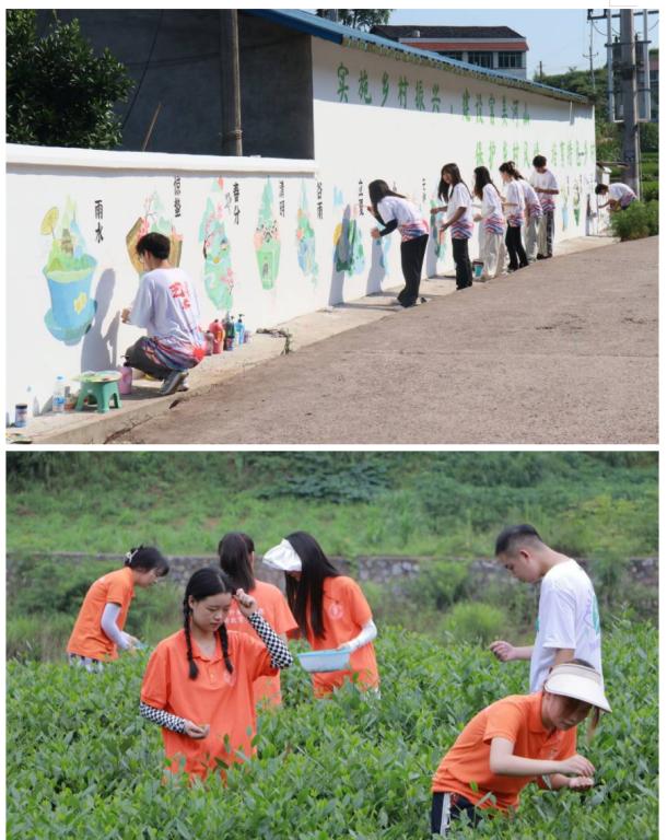 学校充分发挥人文艺术学科专业优势,组织青年学生通过开展文化下乡活动,以艺术为支点撬动新时代乡村振兴。艺术设计学院、音乐舞蹈学院、影视融媒体学院、体育与健康学院将绘画、舞蹈课堂与党史学习教育、基础学科启蒙、民族文化相结合,多角度推进美育实践,用艺术之美培育青少年的红色细胞。舞台搬到家门,音乐舞蹈学院、管理学院、学前教育学院、校级学生组织等把艺术大舞台搬到群众家门口,走进田间地头,开展乡村音乐会、话剧表演等活动,用人民群众喜闻乐见的形式宣传社会主义先进文化,让乡村涌动艺术的脉搏。画笔扮靓乡村,艺术设计学院、学前教育学院、影视融媒体学院,结合乡村社区宣传需求,精心设计墙绘方案,用画笔为村民打造特色墙绘,改善村容村貌,让缤纷色彩滋润群众的精神土壤。