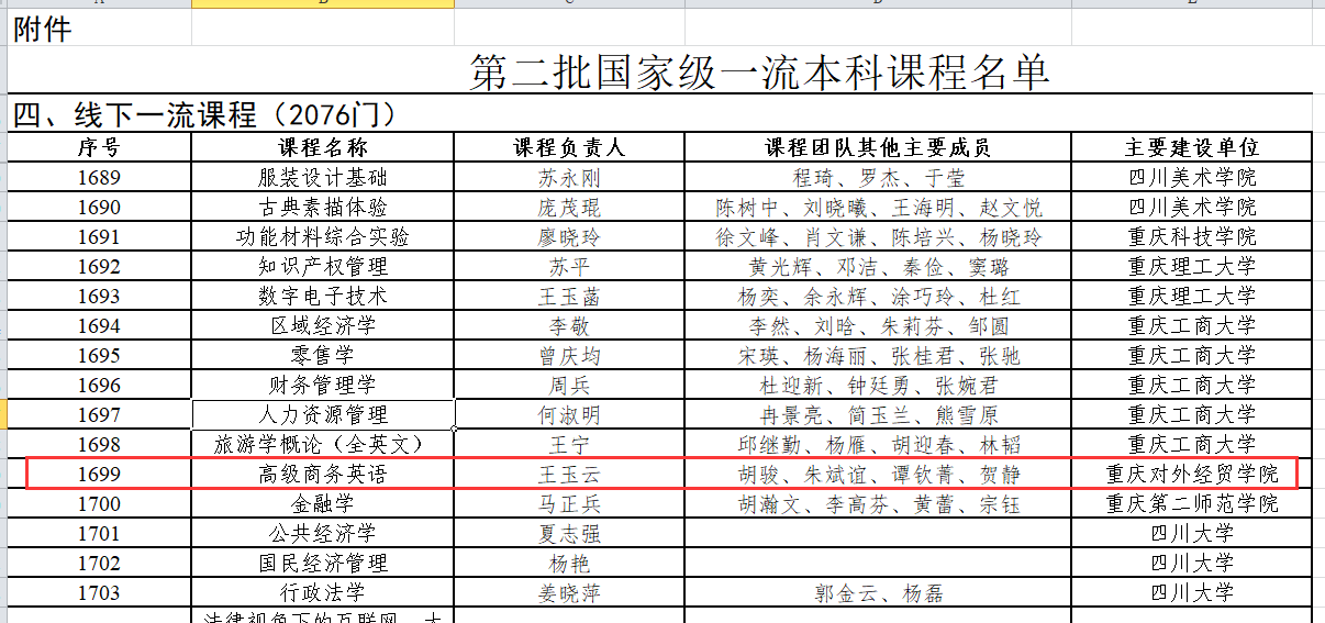 近日,教育部印发《教育部关于公布第二批国家级一流本科课程认定结果的通知》(教高函〔2023〕7号),正式公布了第二批国家级一流本科课程认定结果,学校外语外贸学院王玉云教授负责的《高级商务英语》课程被认定为国家级一流本科课程(线下课程),实现了学校国家级一流本科课程零的突破,在课程建设方面具有里程碑意义。