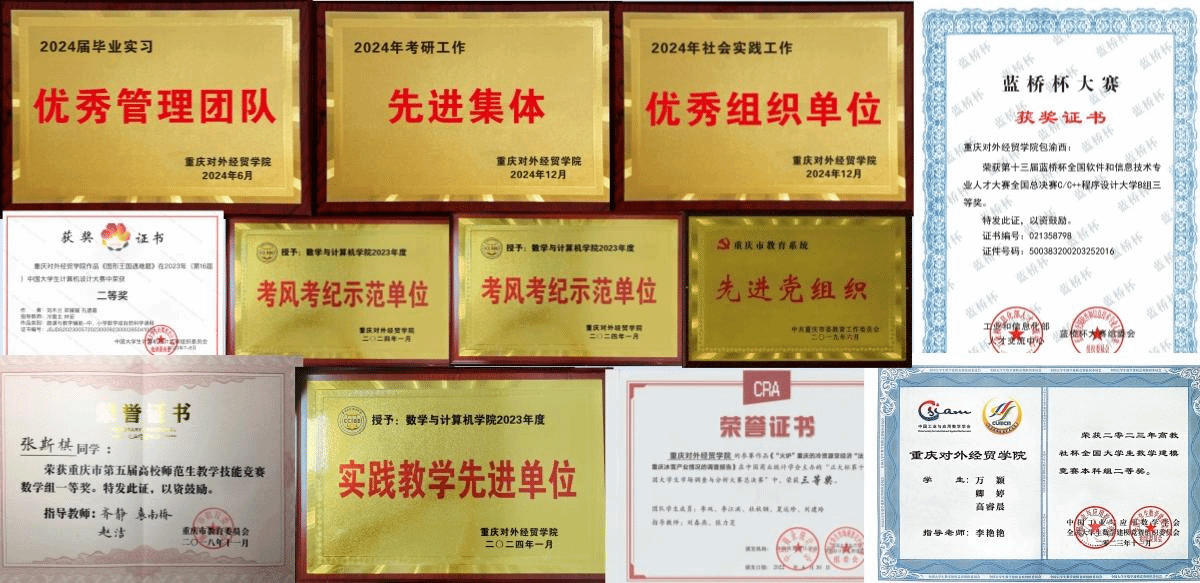 学院坚持“院-校-市-国家-国际”五级竞赛机制,实施“竞赛与课程相结合、竞赛与科研相结合、竞赛与创新相结合”三结合模式,积极鼓励学生参加各级各类学科竞赛。近5年,学生获省部级以上奖项867项,并呈逐年上升态势;部分奖项也有所突破,美国大学生数学建模竞赛M奖,数学建模比赛获全国二等奖,计算机设计大赛全国二等奖,重庆市师范技能大赛中荣获一等奖。
