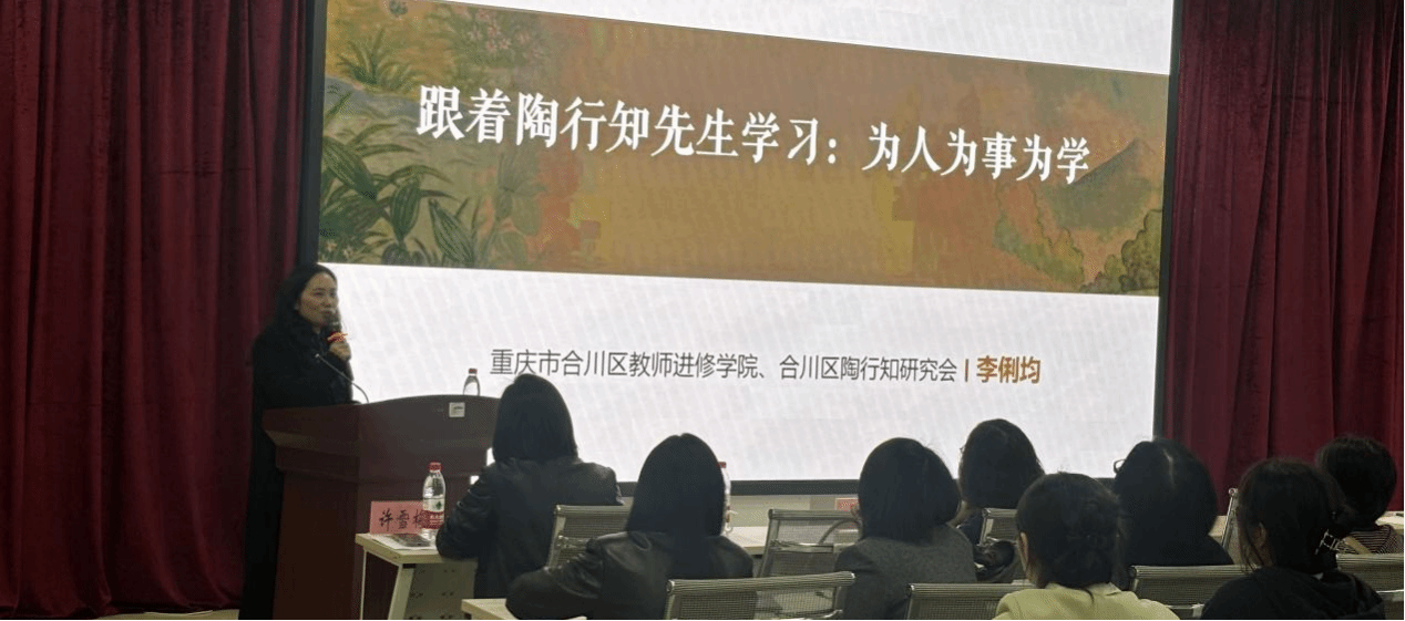 2025年3月25日下午,由科研处主办,教育学院和陶行知教育思想研究中心承办的专题讲座在图书馆A馆行知大讲堂顺利开展,讲座以“跟着陶行知先生学习:为人为事为学”为主题,重庆市合川区教师进修学院副院长、合川区陶行知研究会会长李俐均担任主讲嘉宾,教育学院教学副院长许雪梅与100余名师生共同参与。本次讲座作为学校“师德师风建设”的重要环节,旨在深化师生对陶行知教育精神的理解,推动“捧心而来·育才而去”的教育精神传承。