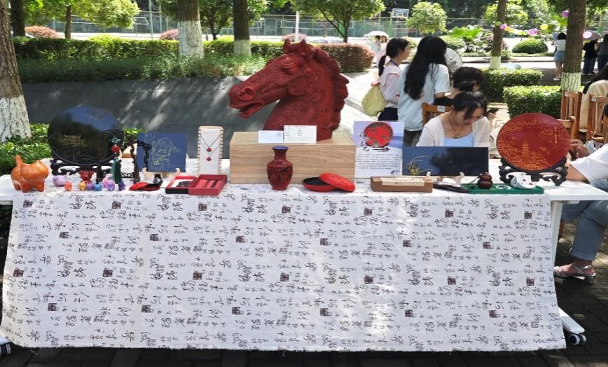 活动现场亮点频出。熊畅老师为活动现场题字,汉服社成员身姿绰约,进行汉服走秀;温纯老师悉心指导同学进行茶艺体验,展现“茶席美学”与“茶香墨韵两相宜”的意境,感受古人“茶禅一味”的智慧;渝派漆艺艺术馆展出了漆雕匠人结合现代设计理念创作的实用艺术品,美不胜收。