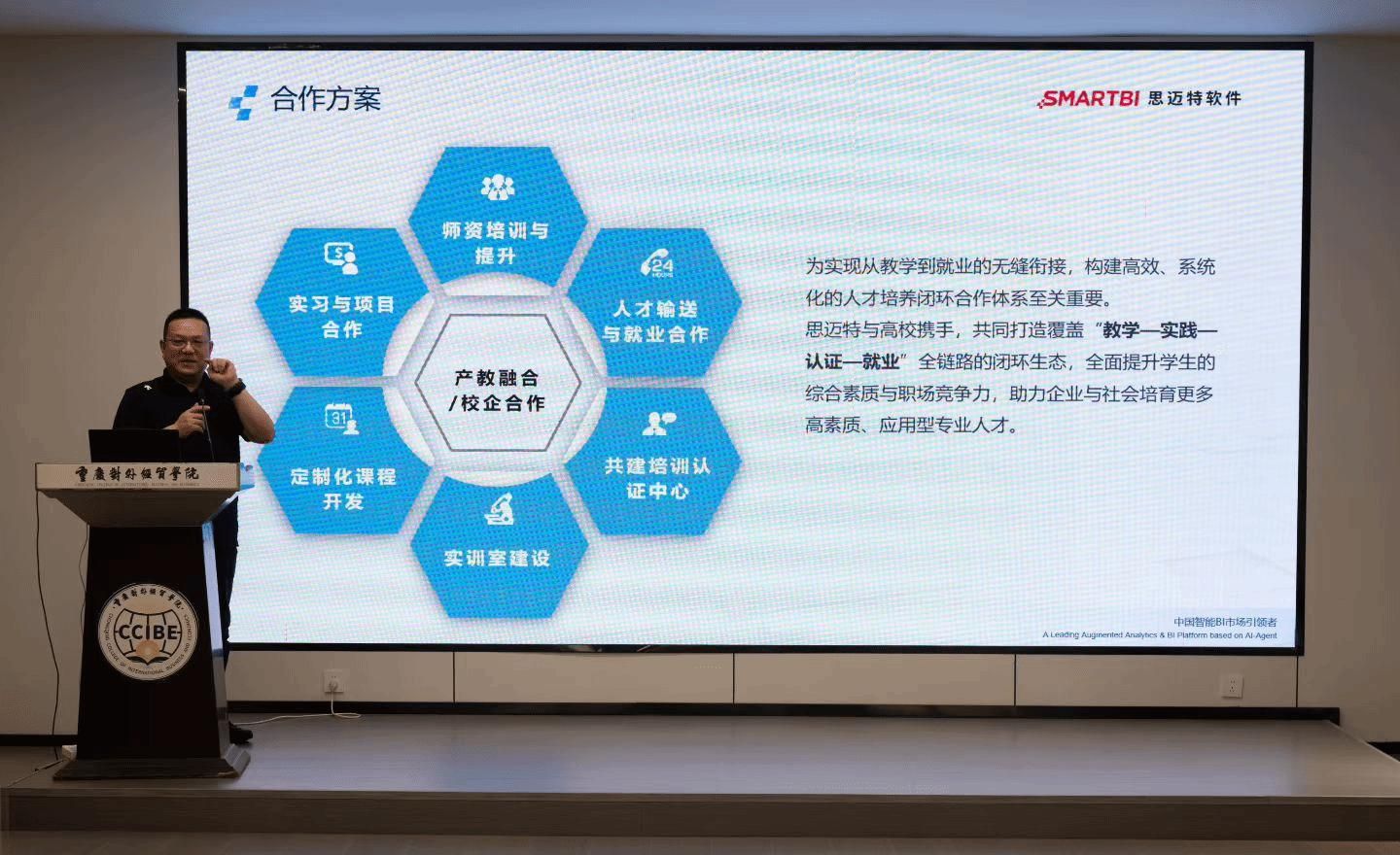 在主题报告环节,三位行业专家围绕“基于AI技术的数据分析行业现状与人才需求”“人工智能与大数据复合型人才产教融合合作方案”以及“智能数据分析实训平台教学与实战”议题展开深入交流。与会专家从行业趋势、教育实践与平台建设等多个维度,系统分析了当前人才培养中存在的挑战与发展机遇,强调必须以实践为导向,强化校企协同,构建符合产业实际的教学与实训体系。座谈研讨环节聚焦“人工智能与大数据人才产教融合痛点破解与育人协同创新”。参会嘉宾围绕课程共建、实训资源整合、校企协同机制等关键问题进行了热烈讨论,提出了一系列兼具前瞻性与可操作性的建议,包括共建产业学院、开发融合型课程、共建共享实训平台等,为推动人才共育、过程共管、成果共享提供了新思路。
