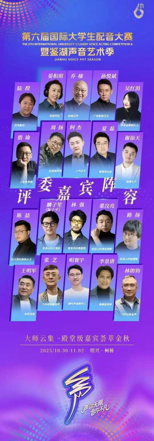第六届国际大学生配音大赛暨鉴湖声音艺术季将于2025年10月30日在浙江绍兴柯桥盛大启幕。作为国内规模最大、国际化程度最高的青年声音艺术盛会,本届大赛以“六年品牌积淀,再度革新升级”为核心,推出“大师云集、赛道革新、声浪盛典、人才直通、云端竞技”等五大特色亮点,并同期举办鉴湖声音艺术季,通过主题漫展、声音剧场等六场多元活动,为全球青年配音爱好者搭建展示才华、对话大师的顶级平台。
